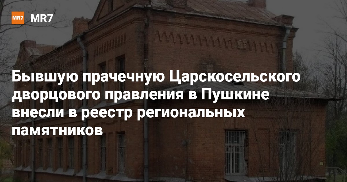 КГИОП 18 декабря объявил о включении в единый реестр региональных памятников аварийного кирпичного здания, в последние годы императорской России выполнявшего функцию механической паровой прачечной Царскосельского дворцового правления в Пушкине. Его адрес — Набережная улица, дом 3.