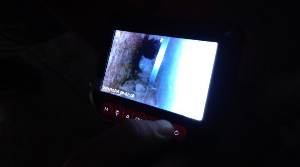 Как сообщает спасатель Сергей Костылев, сначала на вызов выехал его коллега. Он прослушал стену, но не смог точно определить местонахождение питомца. Затем на помощь прибыла вторая группа во главе с Егором, экипированная специальными инструментами, включая камеру для обследования труднодоступных мест.
