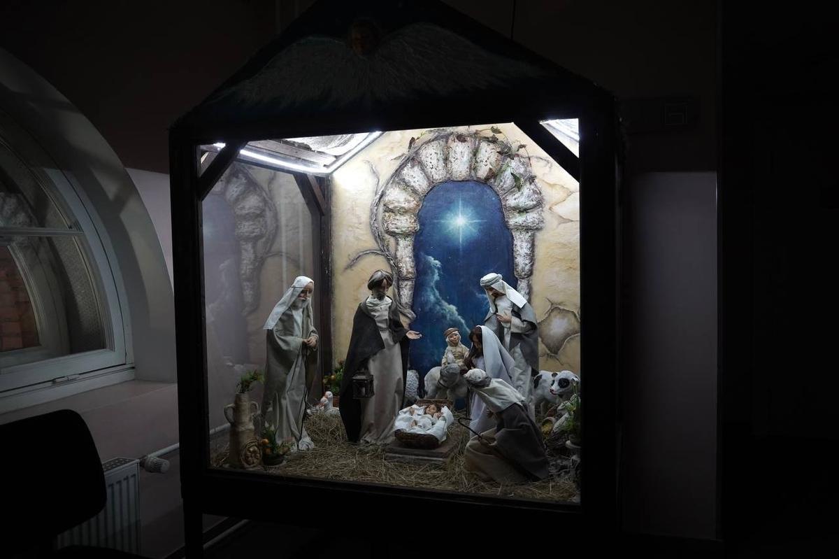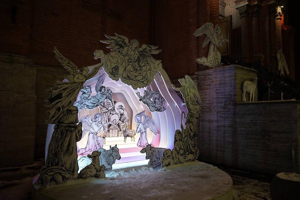 В праздничном украшении храма центральное место занимает вертеп (ясли) с фигуркой младенца Иисуса, и конечно же никуда без рождественской елки.
