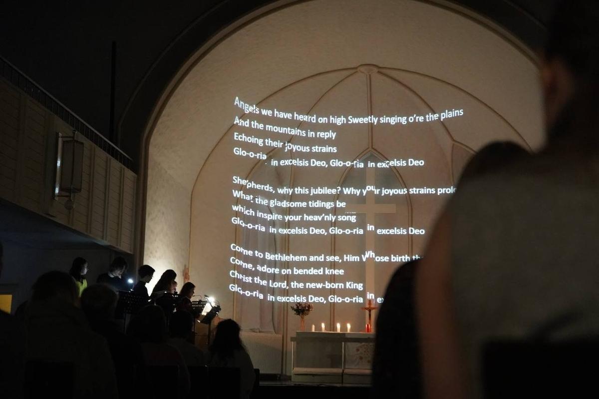 Для удобства прихожан на алтарную стену храма с помощь проектора вывели слова рождественских гимнов.