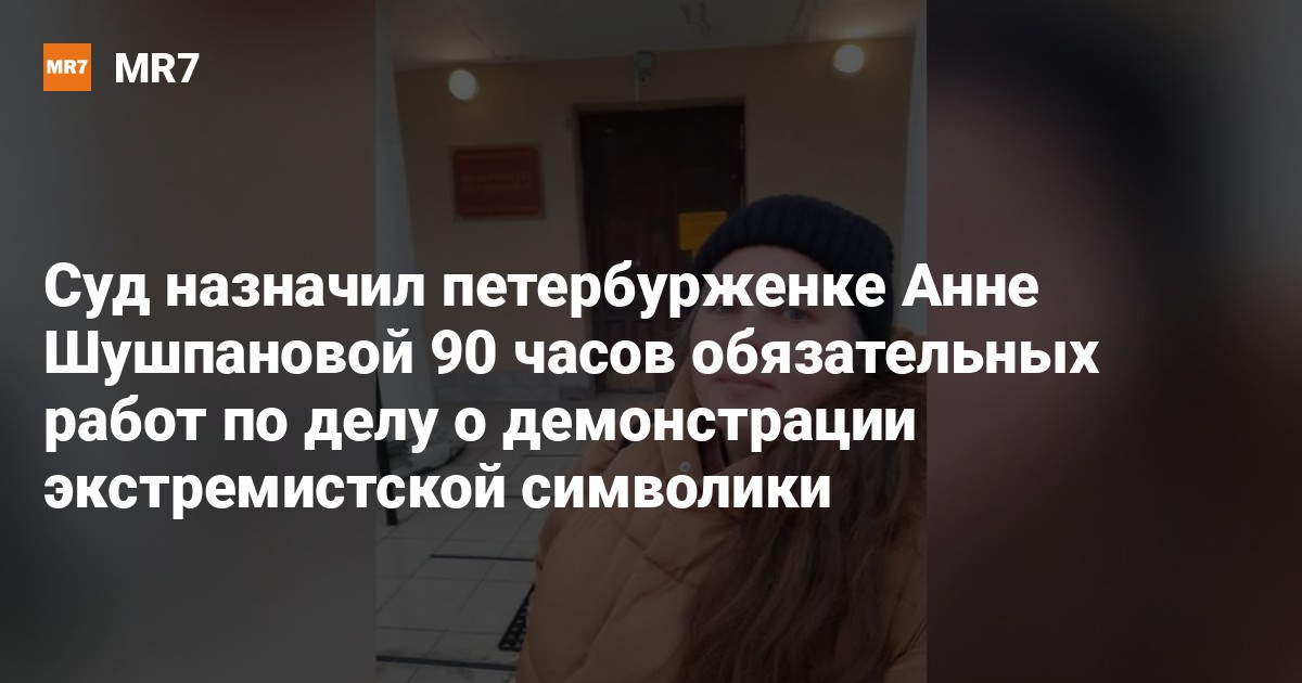 Сестрорецкий районный суд привлёк к ответственности активистку Анну Шушпанову по делу о демонстрации экстремистской символики, обратил внимание MR7. По нашим данным, 22 декабря петербурженке назначили 90 часов обязательных работ.