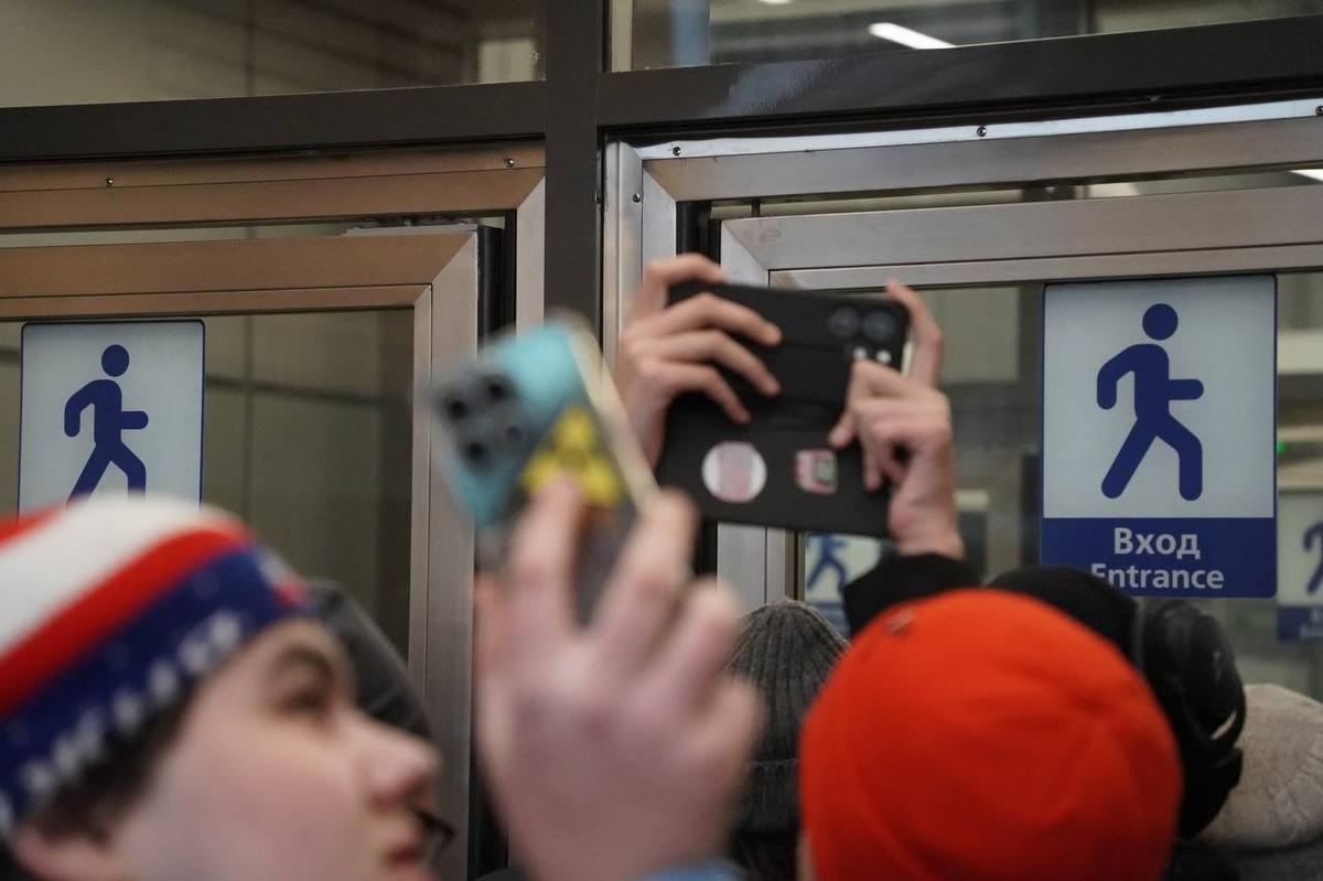 В 15:50 людей попросили встать в колонну и освободить проход. В 16 часов рабочие начали выносить мобильные ограждения. Установили их по периметру станции — так, чтобы не мешать пассажирам красной ветки. Некоторые из ожидавших забирались на плечи друзьям, чтобы видеть лучше.