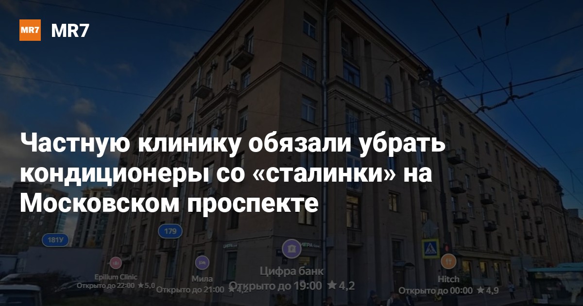 Московский районный суд обязал частную клинику Epilium Clinic демонтировать четыре кондиционера и рекламную конструкцию, расположенные на фасаде дома № 179А по Московскому проспекту. Как сообщает 13 января объединенная пресс-служба петербургских судов, таким образом был удовлетворен иск председателя домового совета.