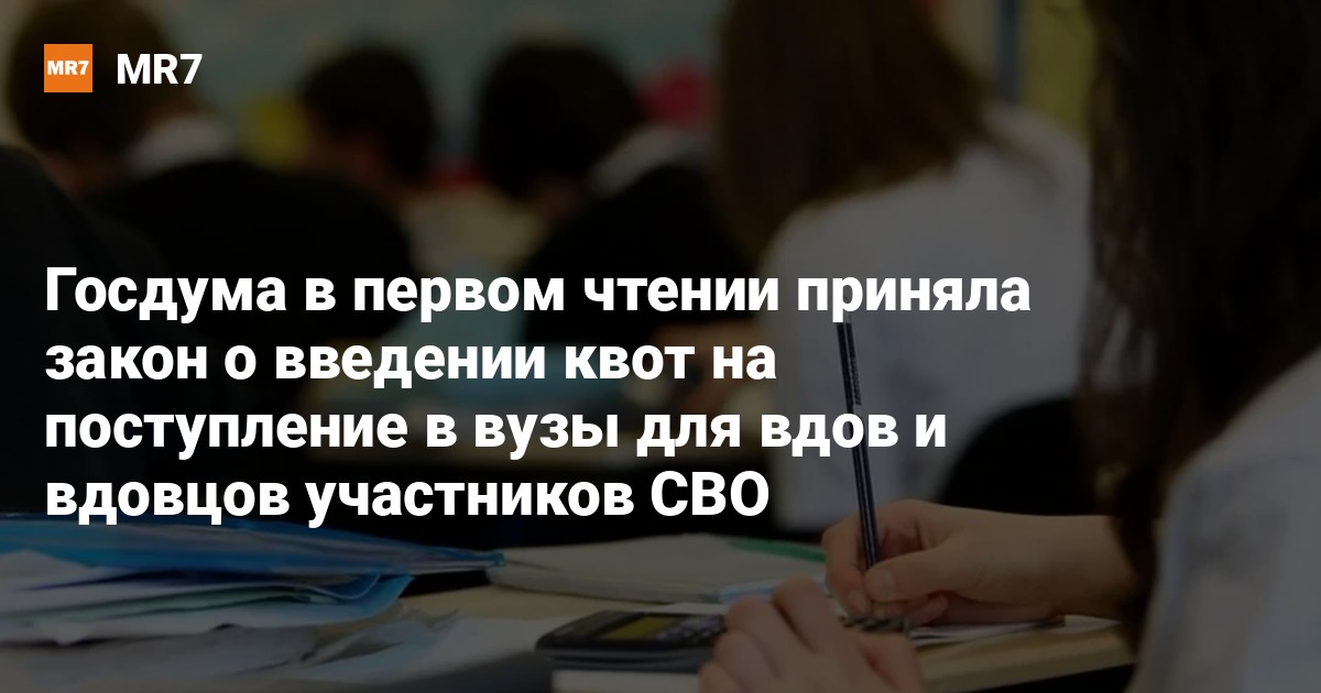 Госдума 13 января в первом чтении приняла законопроект, который предоставляет право на бесплатное поступление в вузы и колледжи без экзаменов вдовам и вдовцам участников специальной военной операции. Инициатива внесена группой сенаторов и депутатов во главе с первым вице-спикером Совета Федерации Владимиром Якушевым.