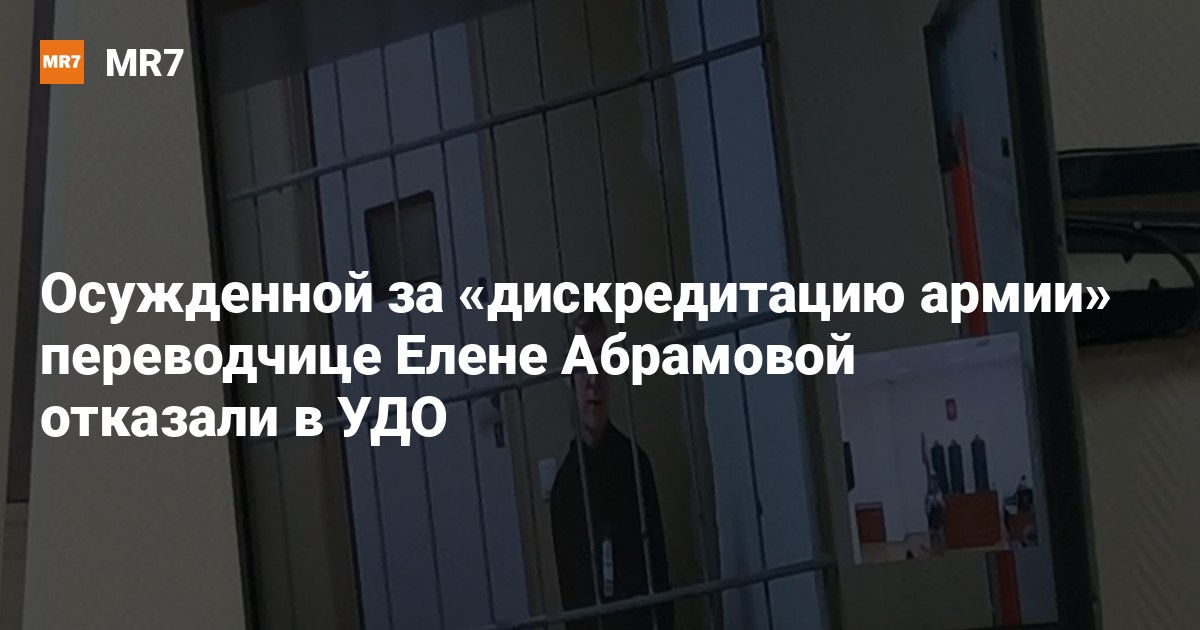 Тосненский городской суд Ленобласти отказал в удовлетворении ходатайства об условно-досрочном освобождении Елены Абрамовой, осужденной по делу о повторной дискредитации армии (статья 280.3 УК). Заседание состоялось накануне, его осветило издание RusNews.