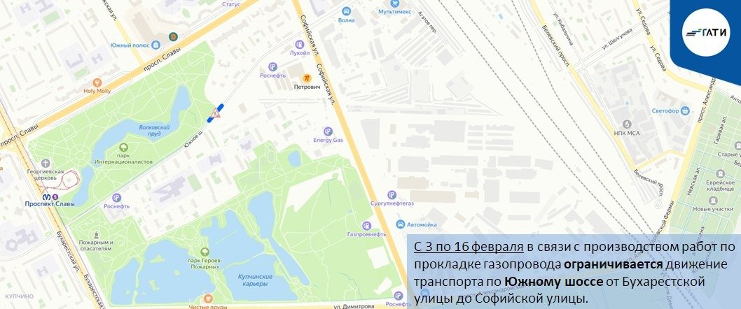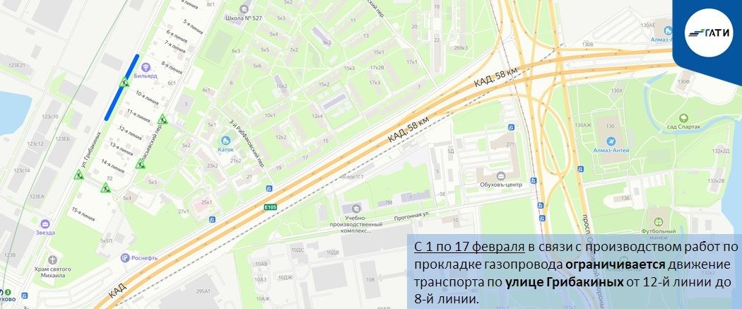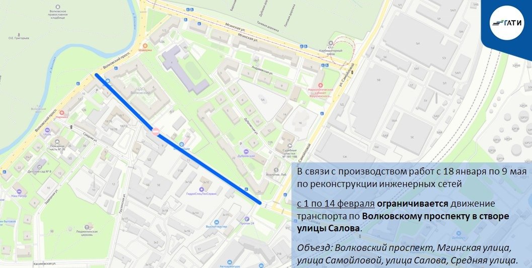 С 2 по 22 февраля движение по Малоохтинскому проспекту будет полностью закрыто от Малоохтинской набережной до Перевозного переулка из-за строительства газопровода. Объезд возможен через Малоохтинскую набережную и Республиканскую улицу.