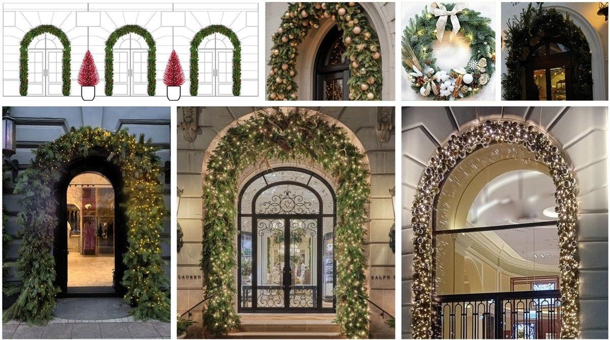 Так выглядят несколько вариантов типовых украшений фасадов с элементами озеленения на Новый год и Рождество.