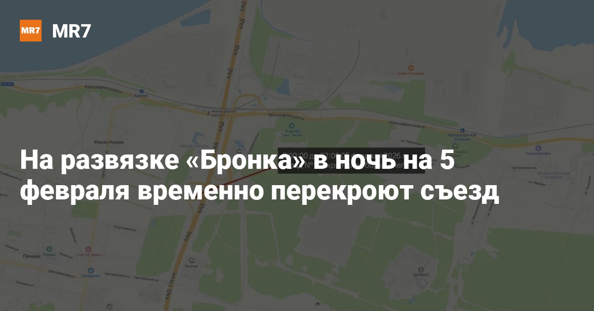 Ночью с 4 на 5 февраля, с 00:00 до 02:00, будут проводиться работы по уборке снежного вала. На это время будет полностью перекрыт Съезд № 1, ведущий с внешнего кольца Кольцевой автодороги в сторону городов Ломоносов и Сосновый Бор.