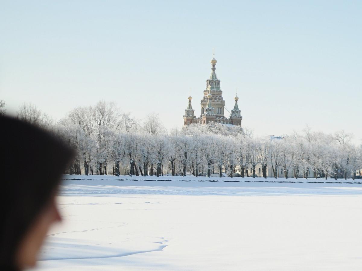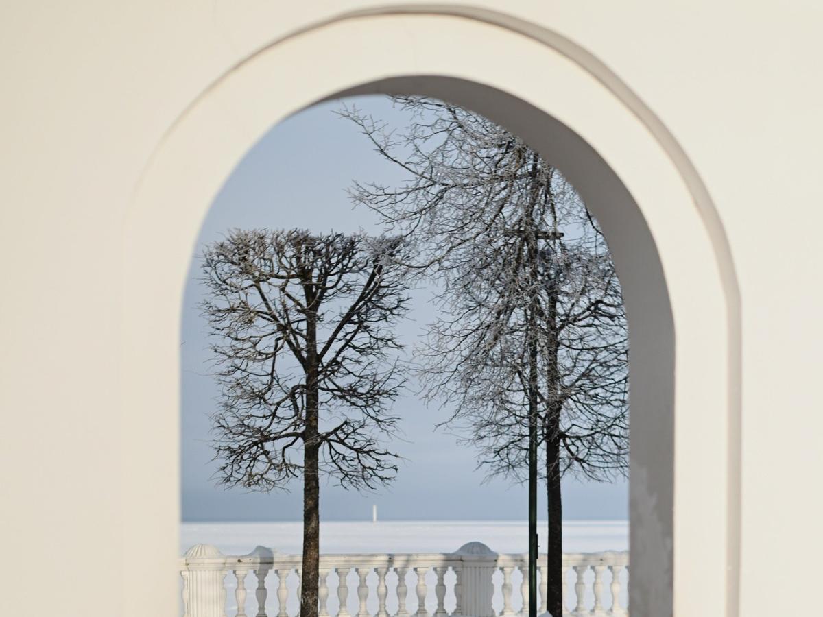 Открывается вид на залив — белый и пронзительно тихий, контрастирующий с привычными для Петергофа летними фонтанами и шумом.