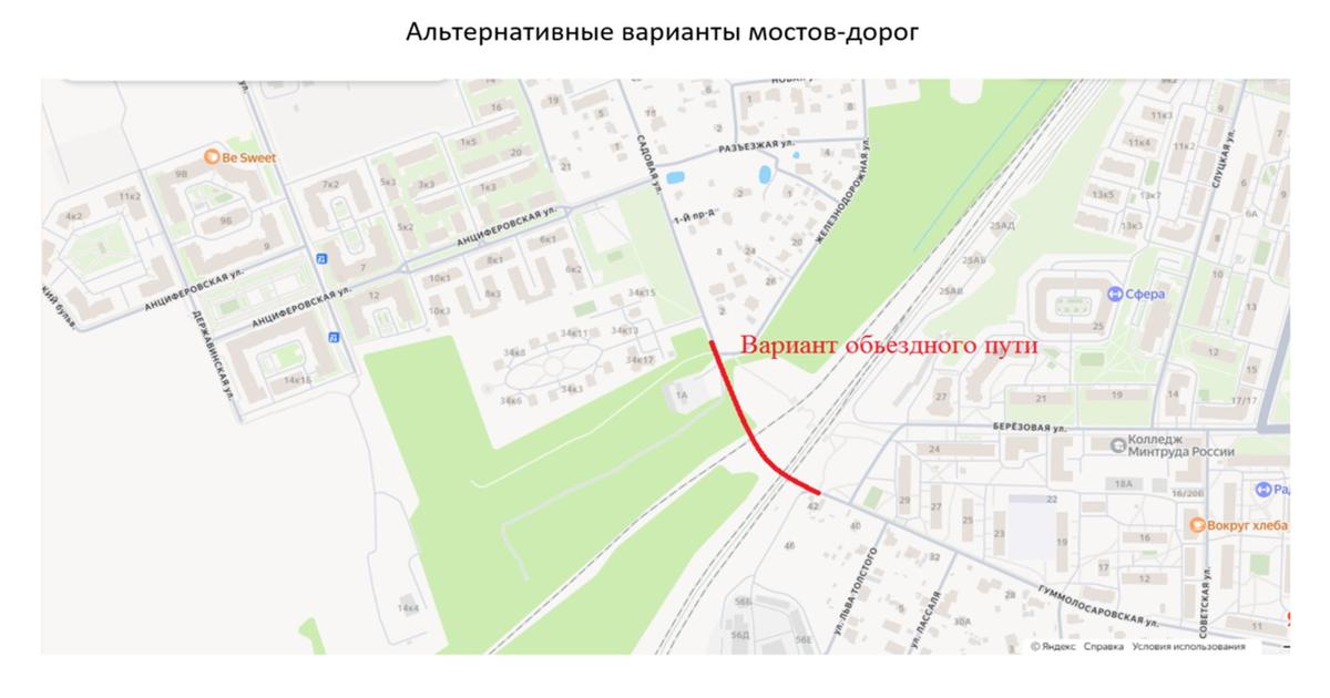 Также среди альтернативных вариантов, предложенных петербуржцами, строительство виадука на Железнодорожной улице в Пушкине или строительство моста над железнодорожными путями между Пушкином и Павловском.