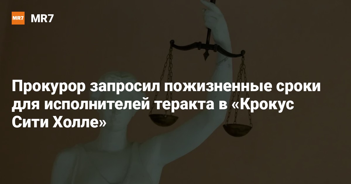 На заседании в Московском городском суде государственный обвинитель потребовал приговорить четверых непосредственных исполнителей теракта в концертном зале «Крокус Сити Холл» к пожизненному лишению свободы с отбыванием в колонии особого режима, сообщает РБК со ссылкой на адвоката Людмилу Айвар.