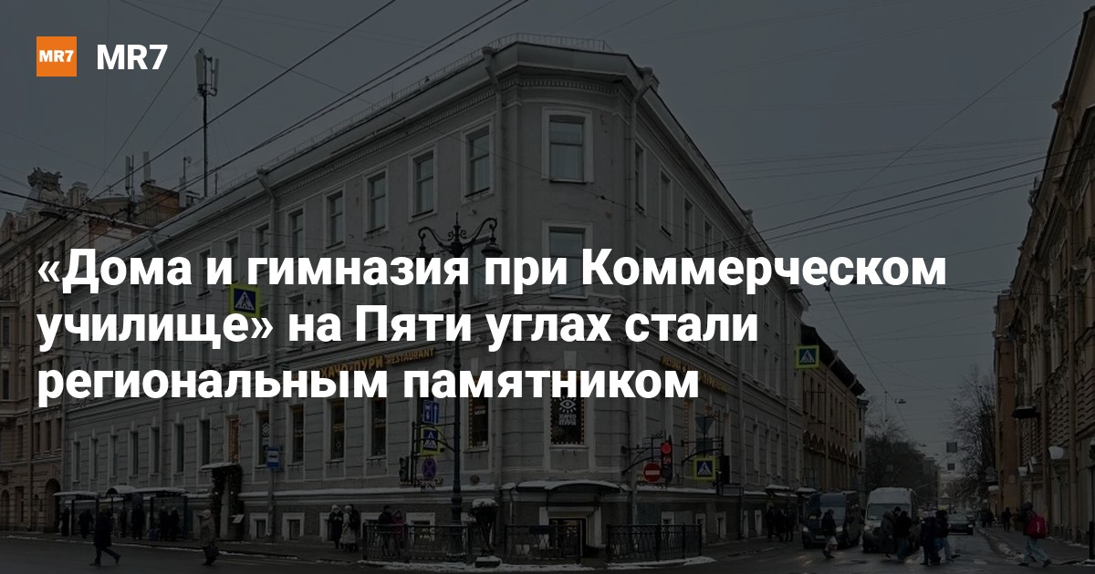 КГИОП 20 февраля объявил о включении в единый реестр региональных памятников комплекса зданий на Пяти углах. Это «Дома и гимназия при Коммерческом училище» (ул. Ломоносова, д. 11-13, литера А). В состав объекта культурного наследия входят:
