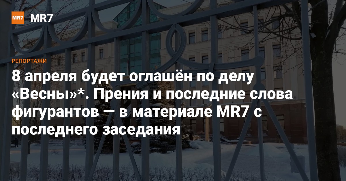 25 февраля в Горсуде Петербурга завершили заседания по уголовному делу «Весны»*. За восемь часов в прениях выступили четверо подсудимых и их адвокаты. Стороны обошлись без реплик. Ещё за полчаса все фигуранты выступили с последними словами. Судья Ирина Фурманова взяла больше месяца на подготовку приговора.