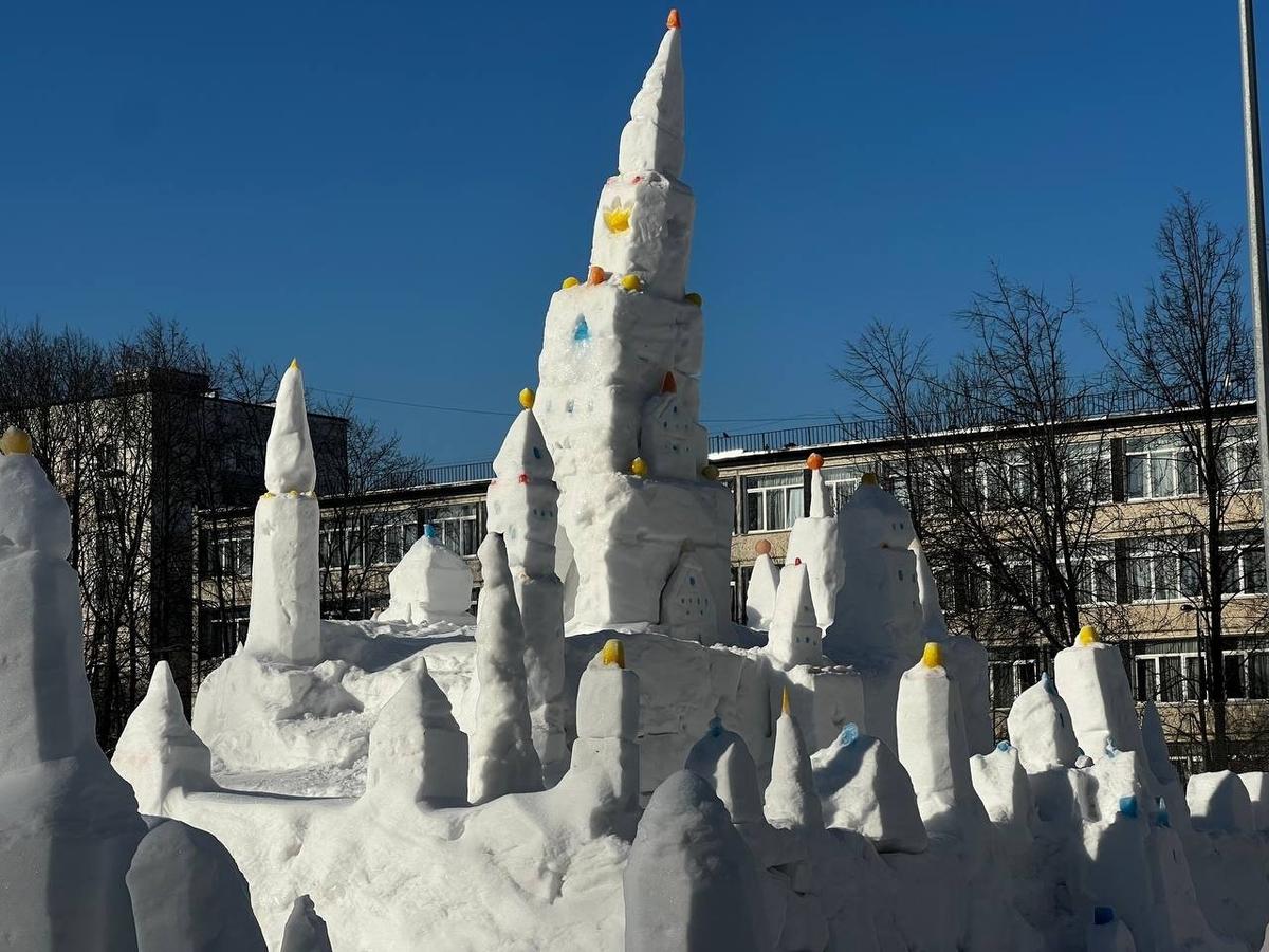 Напомним, в этом году это уже как минимум второй замок мастеровитого дворника у школы. Первый, появившийся ещё в ноябре, к сожалению, не перенёс декабрьских оттепелей. В январе дядя Саша начал возводить новую крепость. На основные работы ушло около двух недель. Улучшать и украшать строение можно бесконечно.