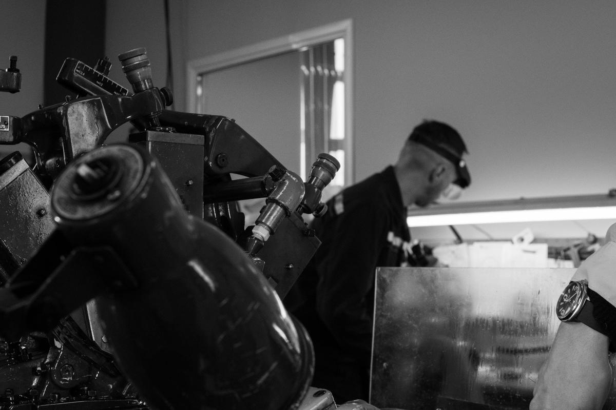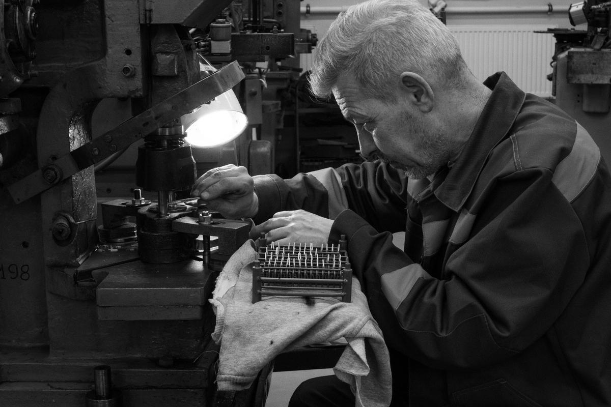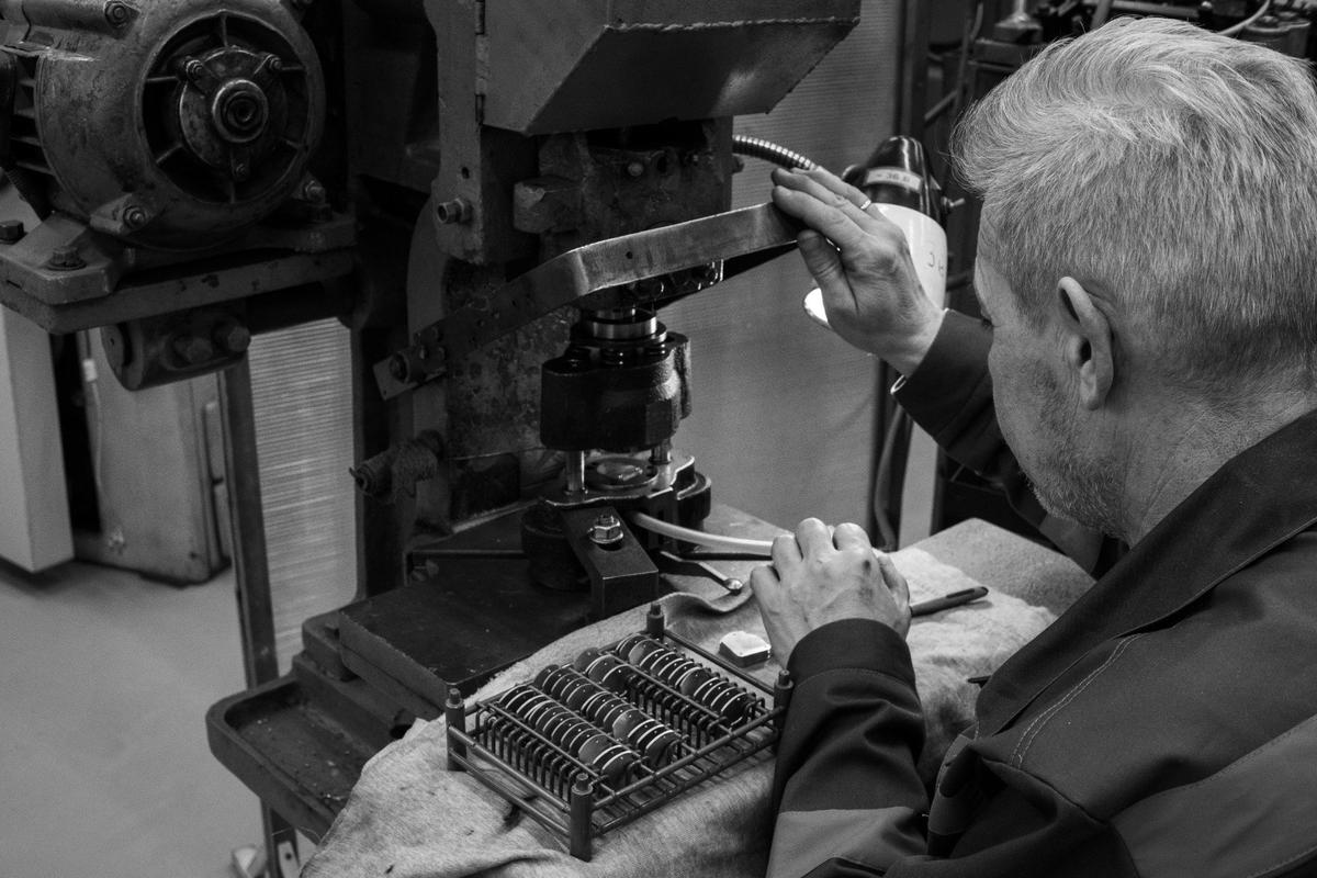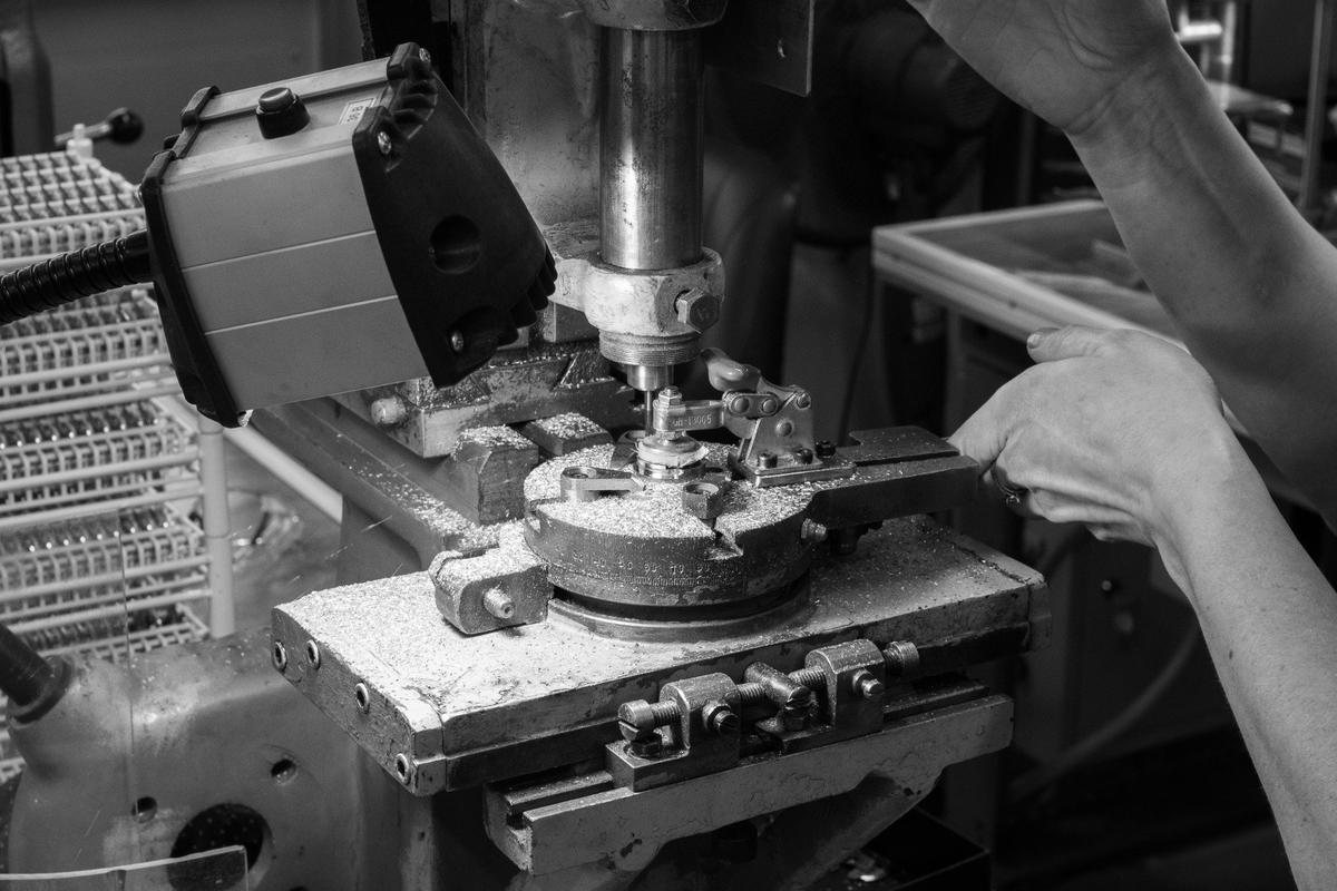 Шумно здесь из-за пресса, при помощи которого вырубают крупные — по меркам часов — сегменты (они могут доходить до одного-двух сантиметров; мелкие же измеряются в долях миллиметров). После этого составляющие кладут в особые решётки и полируют наждачной бумагой.