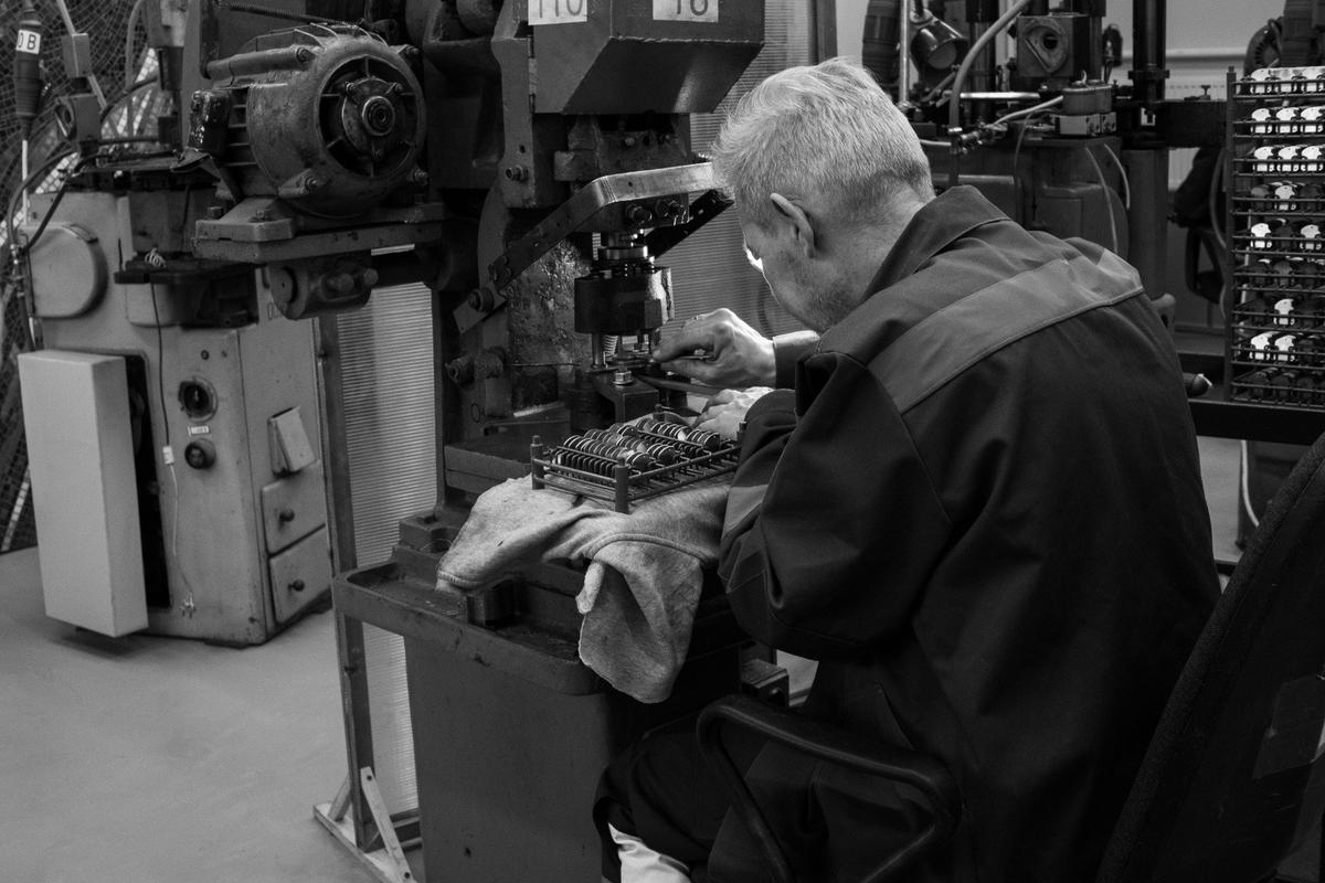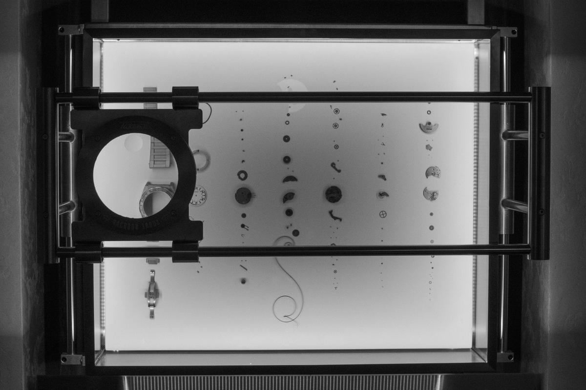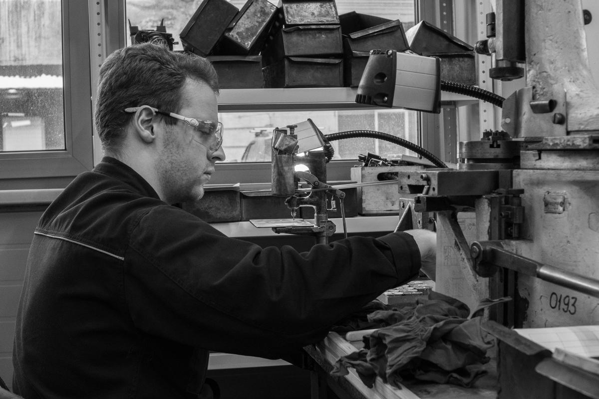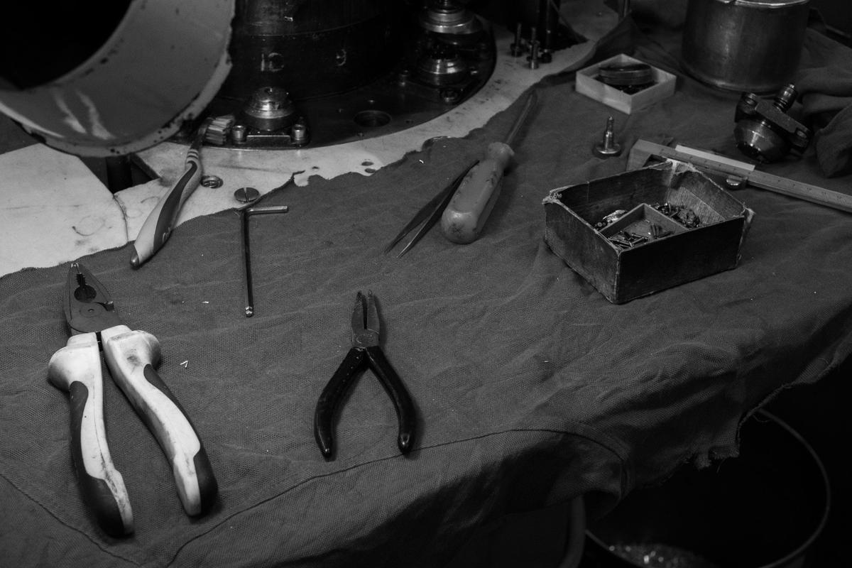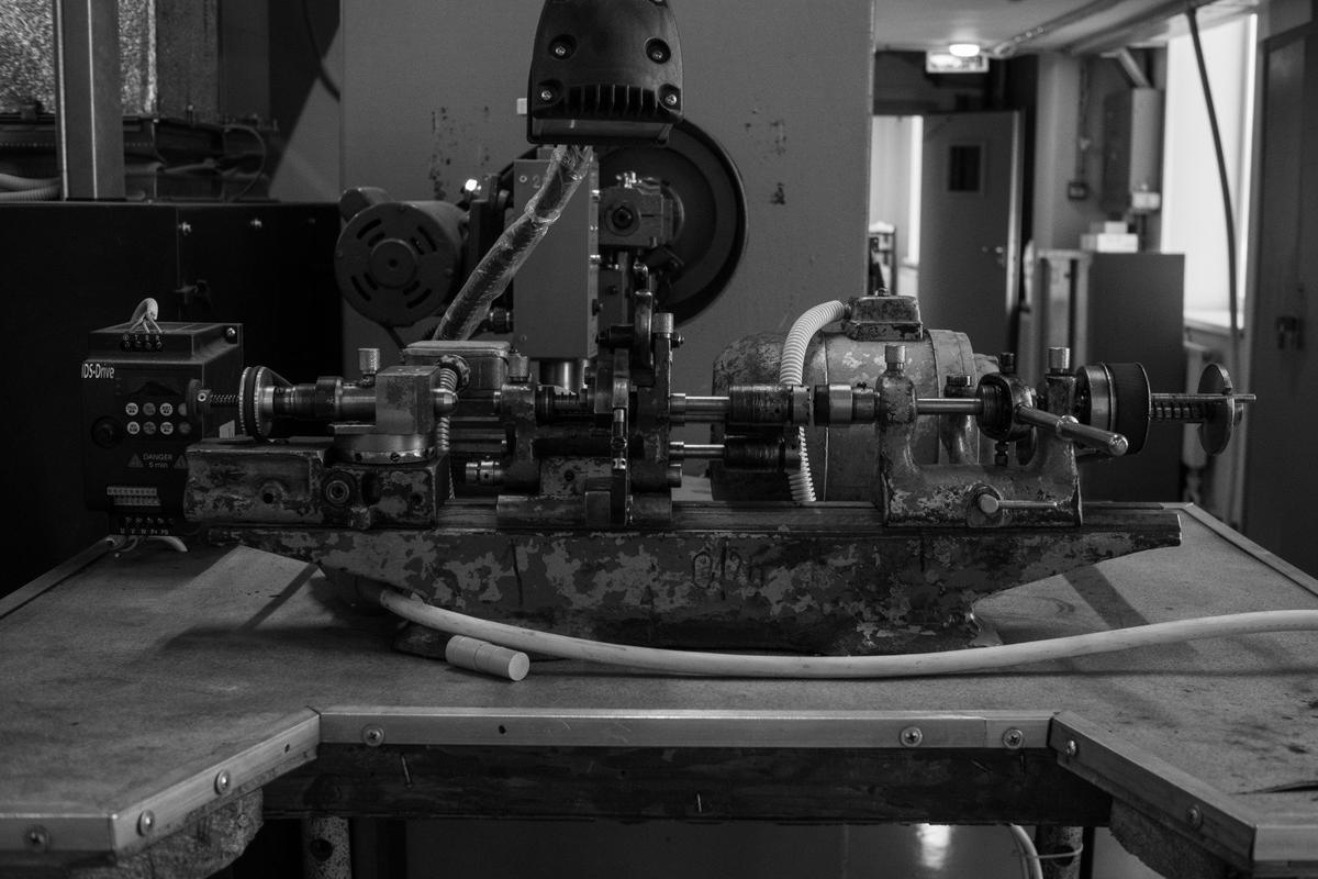 Шумно здесь из-за пресса, при помощи которого вырубают крупные — по меркам часов — сегменты (они могут доходить до одного-двух сантиметров; мелкие же измеряются в долях миллиметров). После этого составляющие кладут в особые решётки и полируют наждачной бумагой.