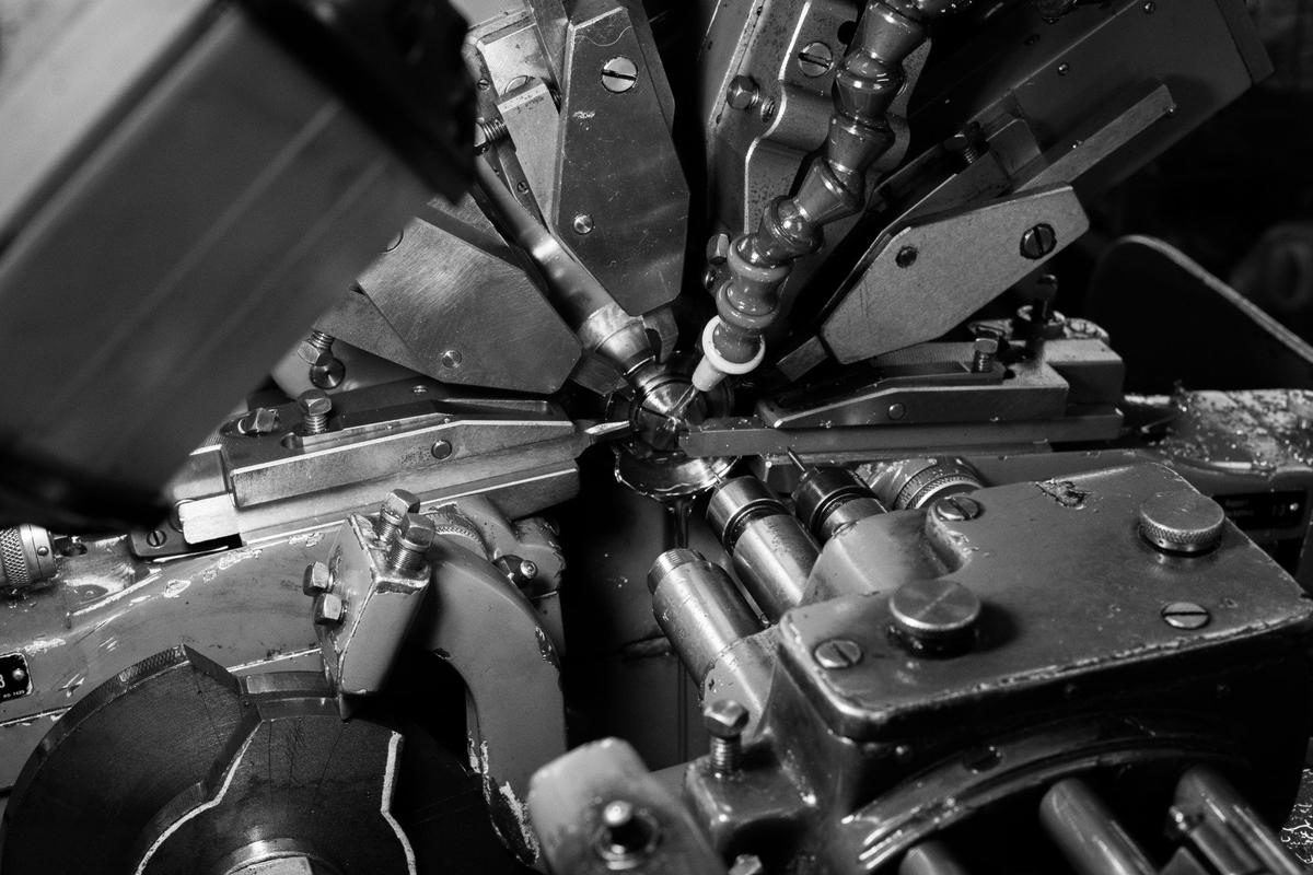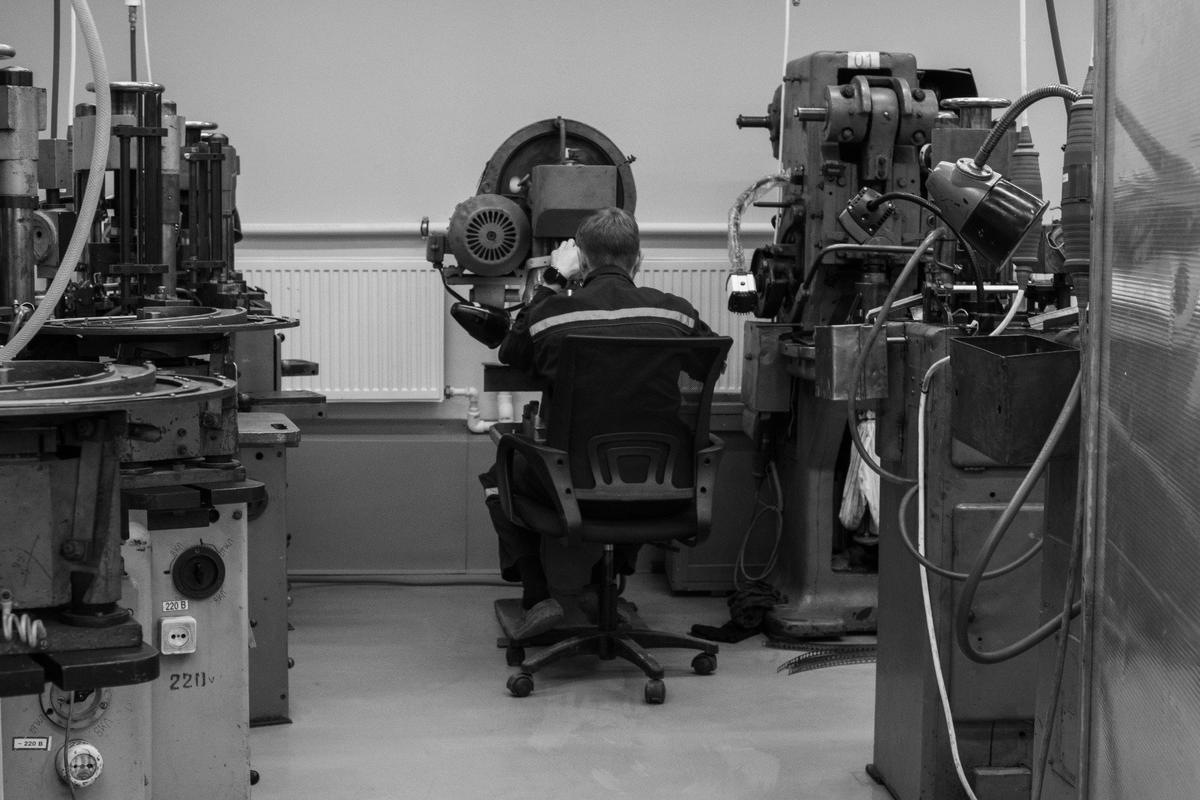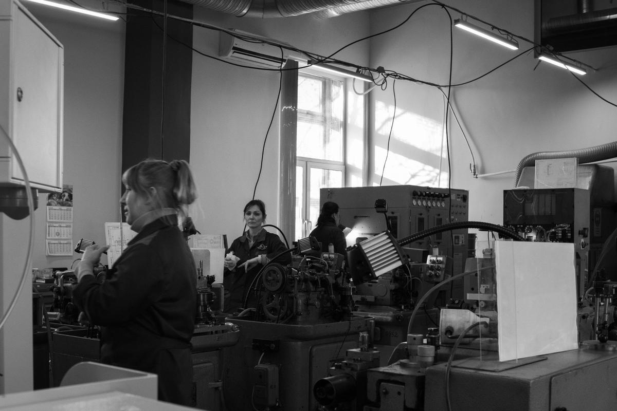 Поднимаемся на третий этаж. Здесь вытачивают элементы часового хода — колёса, винты, оси, штифты, бушоны. Пахнет машинным маслом — в него скатывается сформированная и подрезанная деталь.