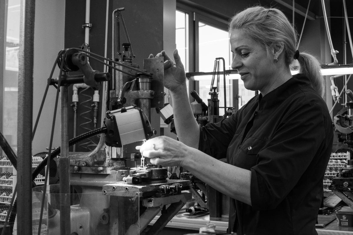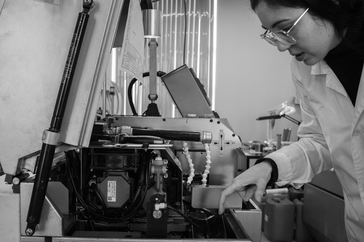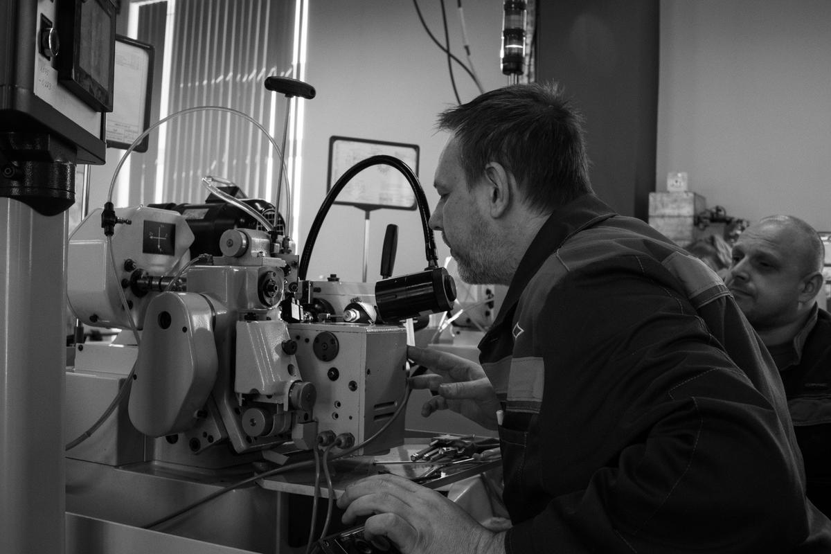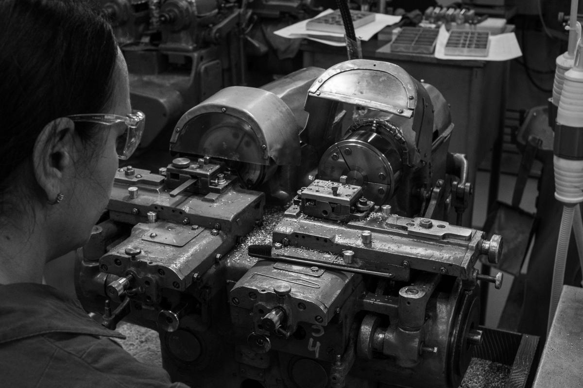 Поднимаемся на третий этаж. Здесь вытачивают элементы часового хода — колёса, винты, оси, штифты, бушоны. Пахнет машинным маслом — в него скатывается сформированная и подрезанная деталь.