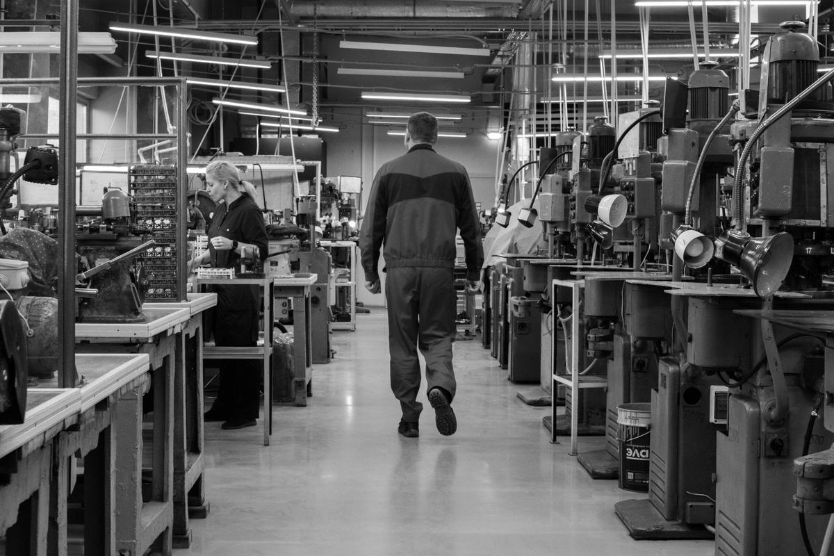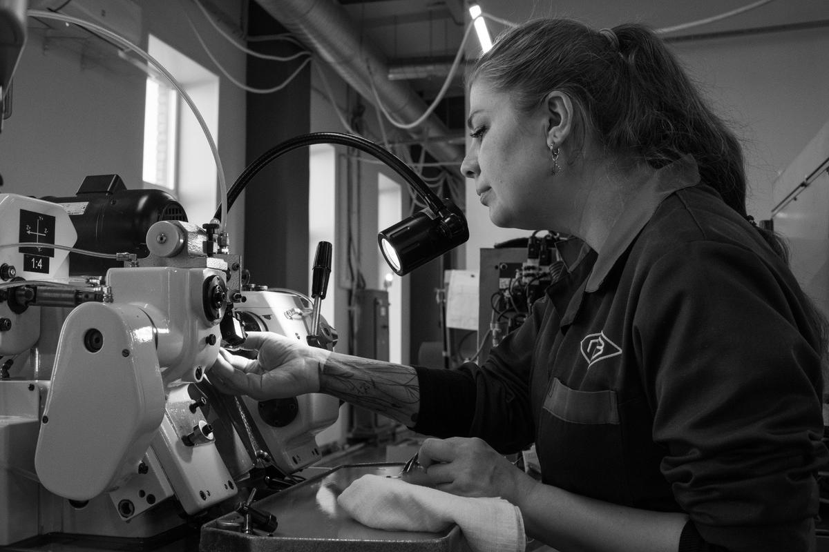 У станков сосредоточенно сидят мастера. Всего на заводе трудится 150 человек.