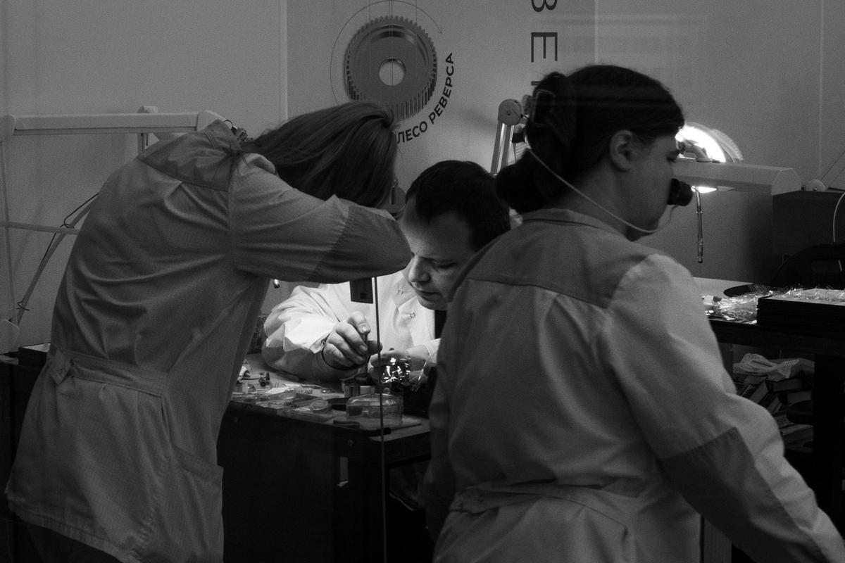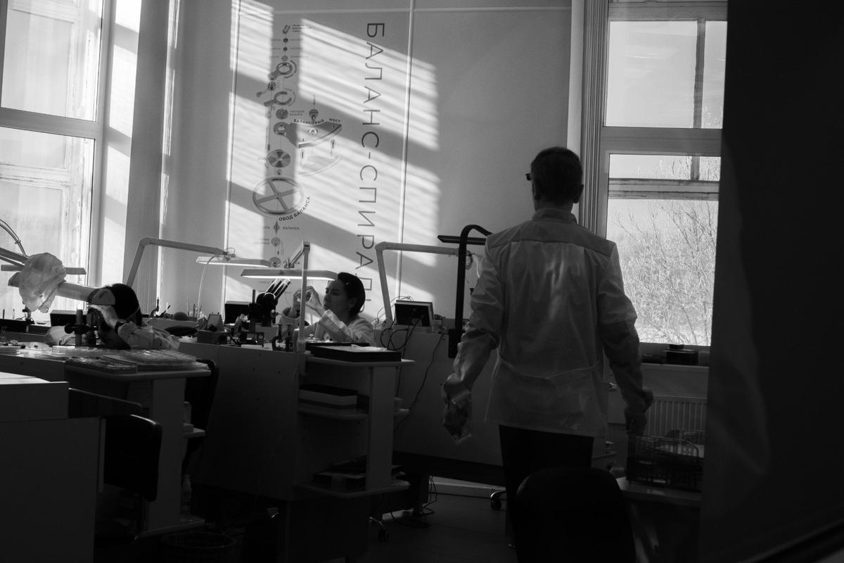 Наконец, мы подходим к святая святых завода. За стеклом видна работа мастеров в белых халатах. Перед ними — микроскопы. Они напоминают кардиохирургов.