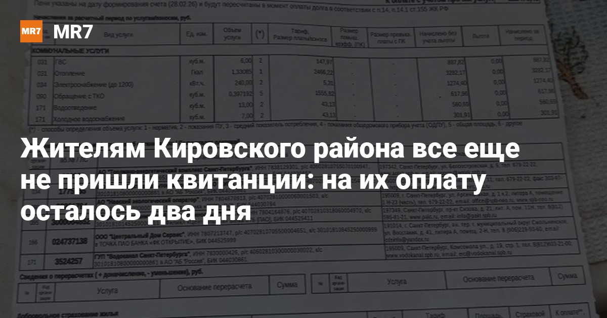 В Кировском районе Петербурга растет недовольство из-за задержки квитанций за жилищно-коммунальные услуги. По новым правилам, вступившим в силу в марте, они должны приходить не позднее 5-го числа каждого месяца. Однако платежные документы за март многим не пришли и 13-го числа. Между тем, оплатить «коммуналку» нужно до 15-го.