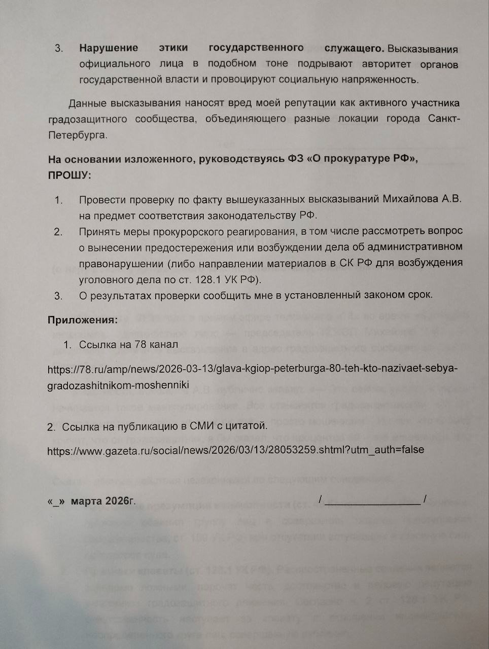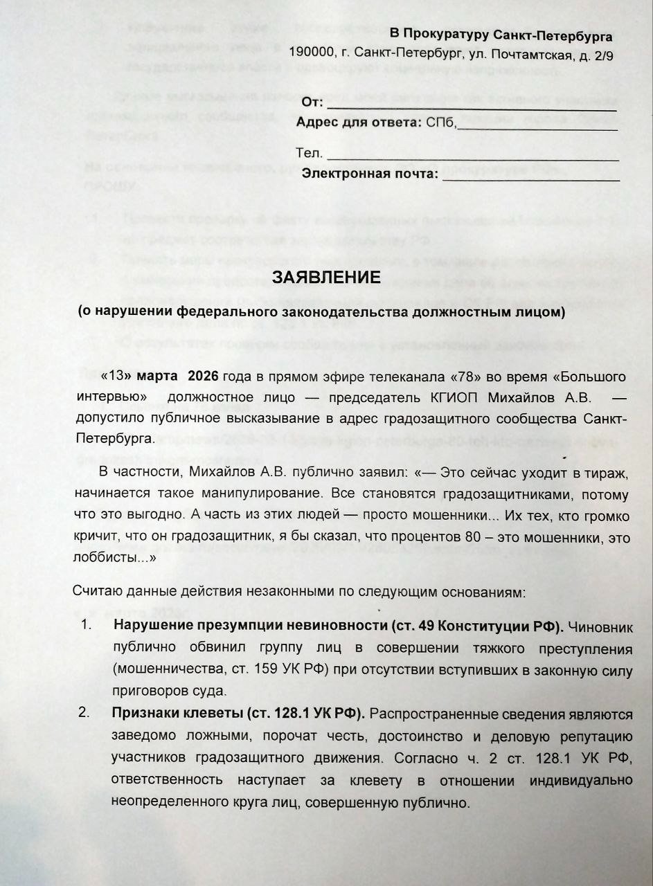 В ответ на это активисты подали заявление в прокуратуру. Они ссылаются на статью Конституции о презумпции невиновности. Градозащитники подчёркивают, что Михайлов публично обвинил группу лиц в тяжком преступлении — мошенничестве — при отсутствии вступившего в силу приговора суда. Помимо этого, распространённые сведения заведомо ложны и порочат честь и деловую репутацию участников движения, считают заявители.