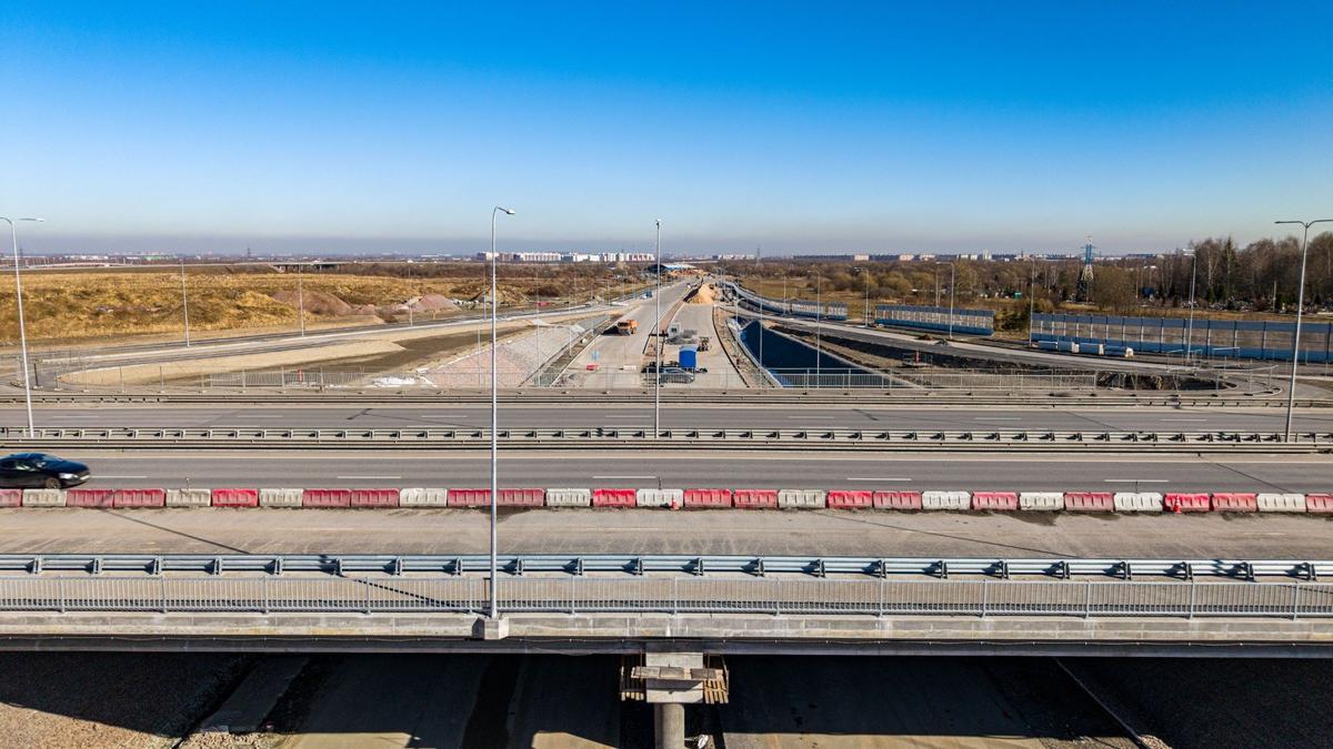 Строители активно занимаются обустройством дорожной инфраструктуры: устанавливают около четырех тысяч метров шумозащитных экранов и оборудуют автобусные остановки. Также продолжаются работы на двух путепроводах через железнодорожные линии Балтийского и Витебского направлений — оба объекта находятся в высокой степени готовности.