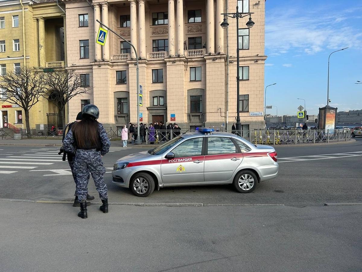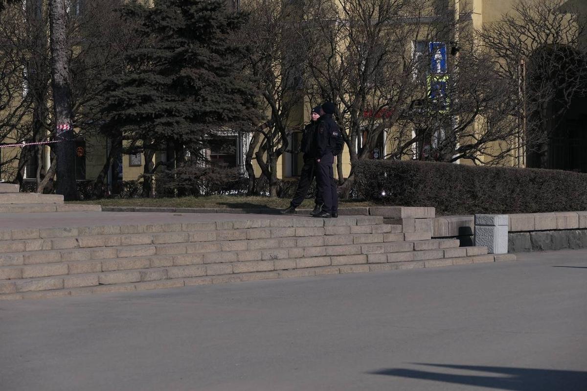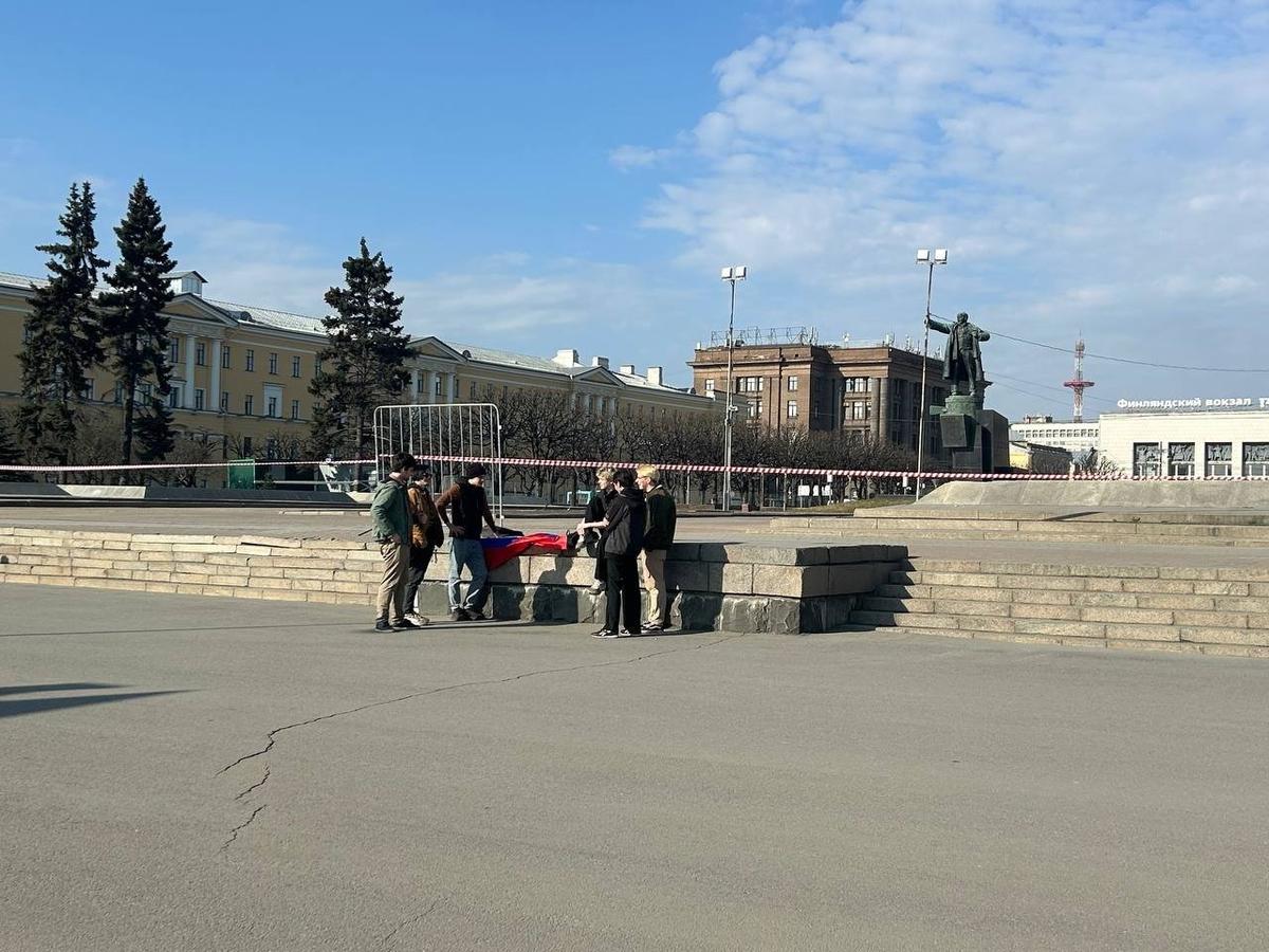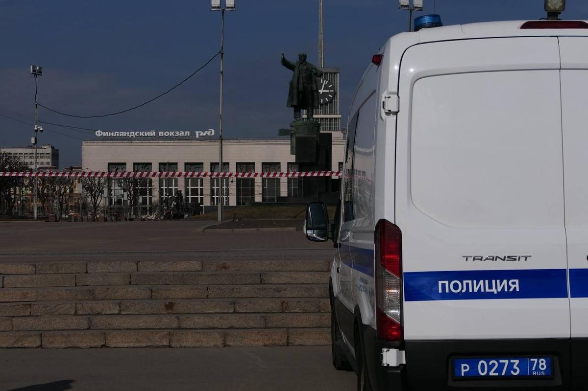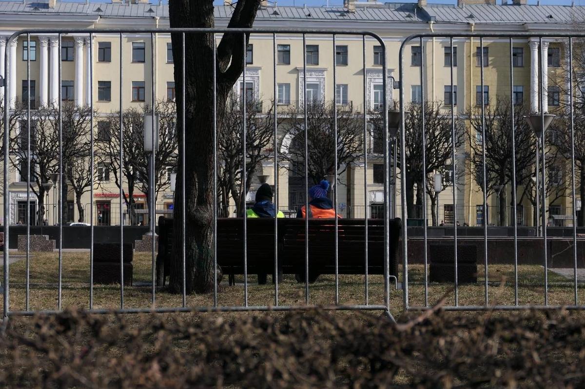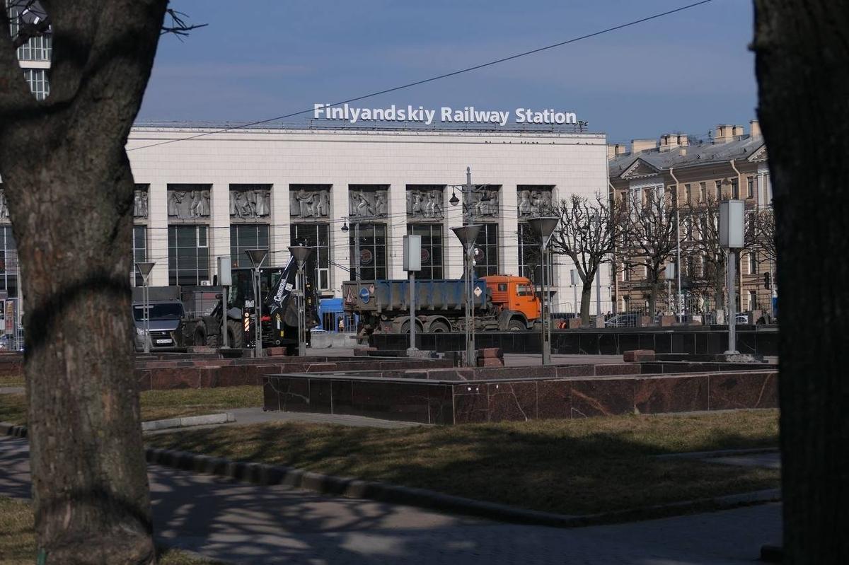 На площади Ленина перед Финляндским вокзалом днем 29 марта можно видеть барьер из ограждений. К фонтанам и памятнику, где прохожие любят отдыхать в хорошую погоду, не подобраться.