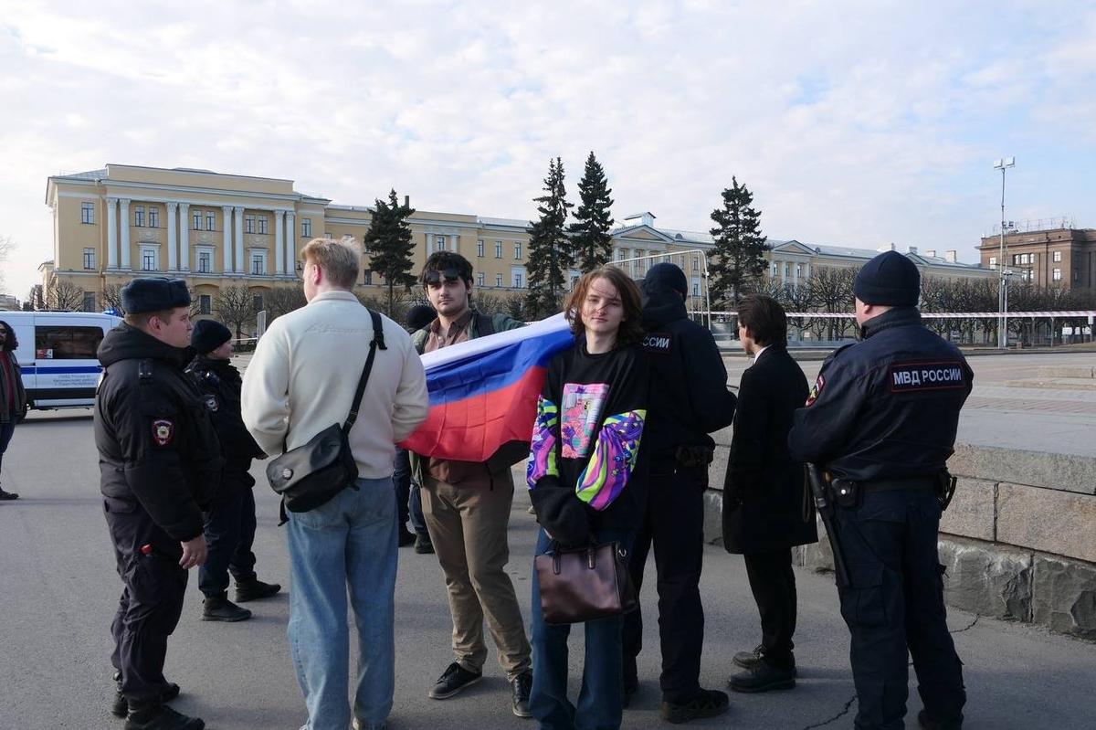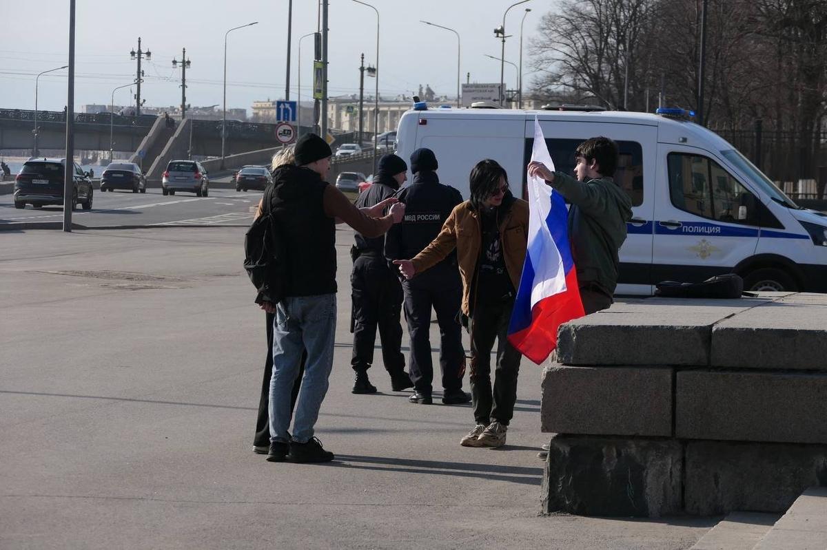 UPD 15:50 Со стороны набережной собралось 25—30 человек. Полицейские сфотографировали их на личные телефоны. Молодых людей с триколором попросили обойтись без лозунгов и плакатов, не сидеть на флаге и переместиться в «более спокойное место». Собравшиеся решили исполнить национальный гимн РФ.