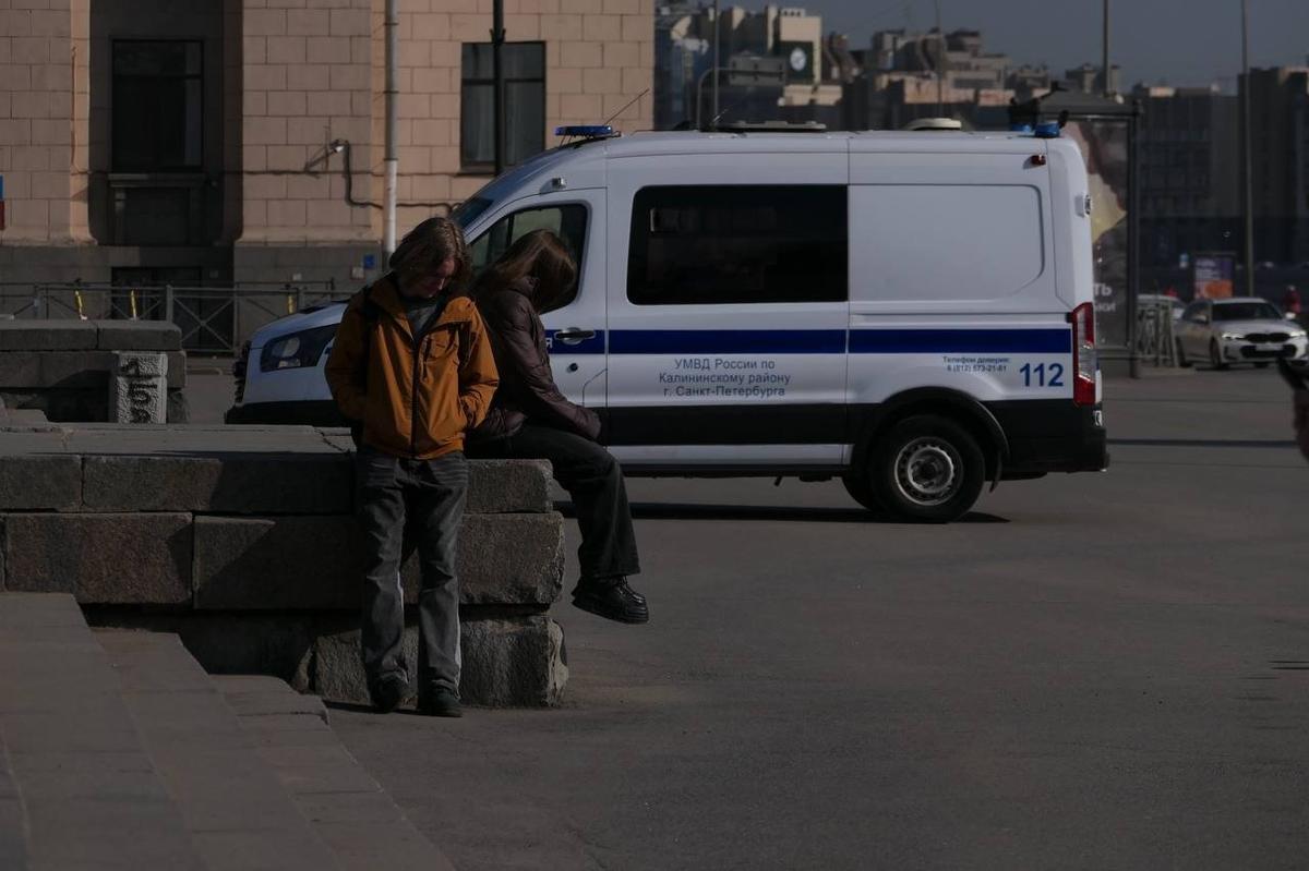 Вокруг дежурят полицейские. Рядом с машиной полиции группа молодежи держит в руках российский триколор. Силовики переговариваются по телефону.