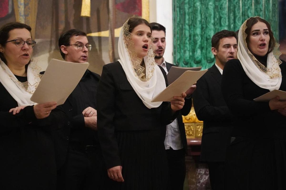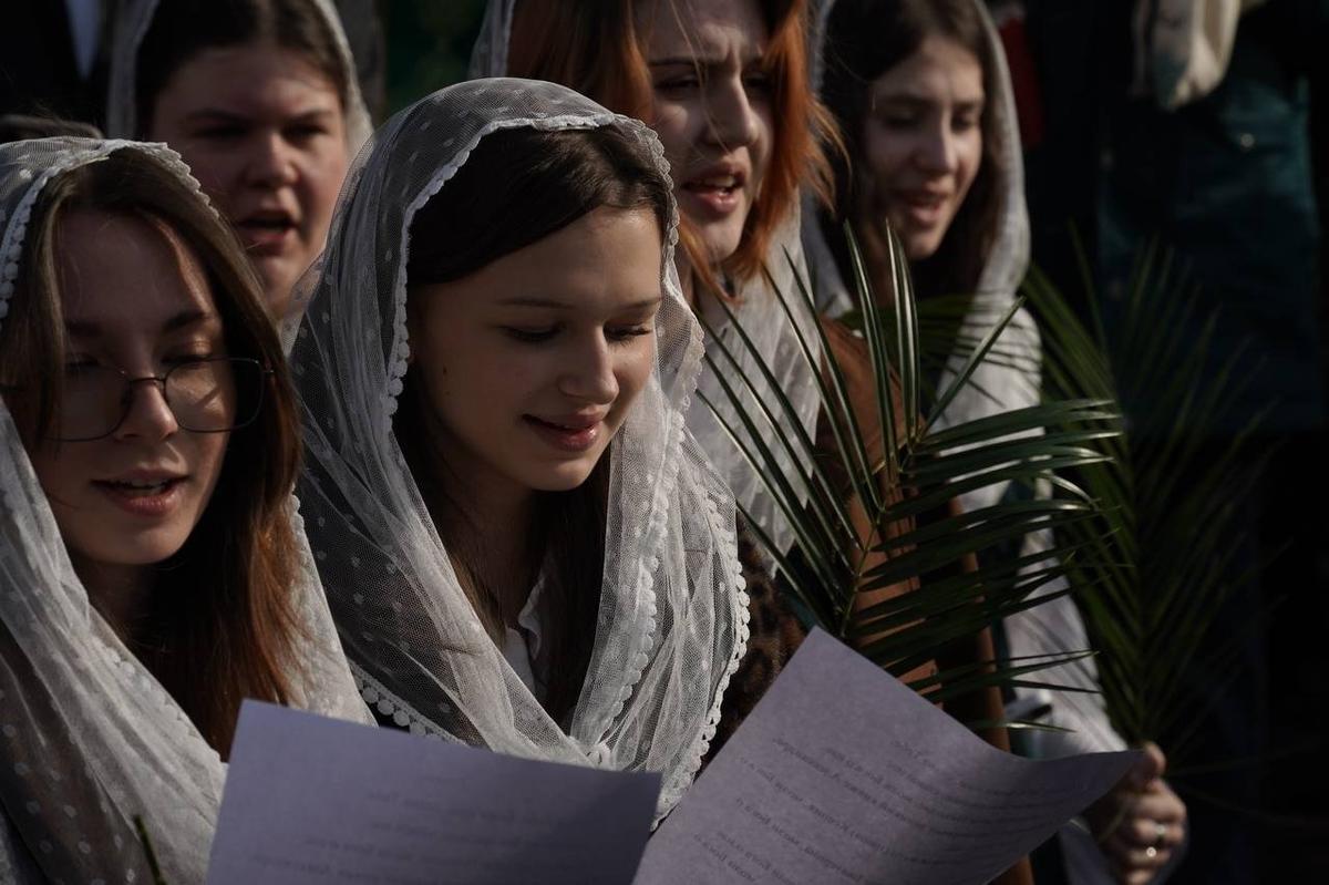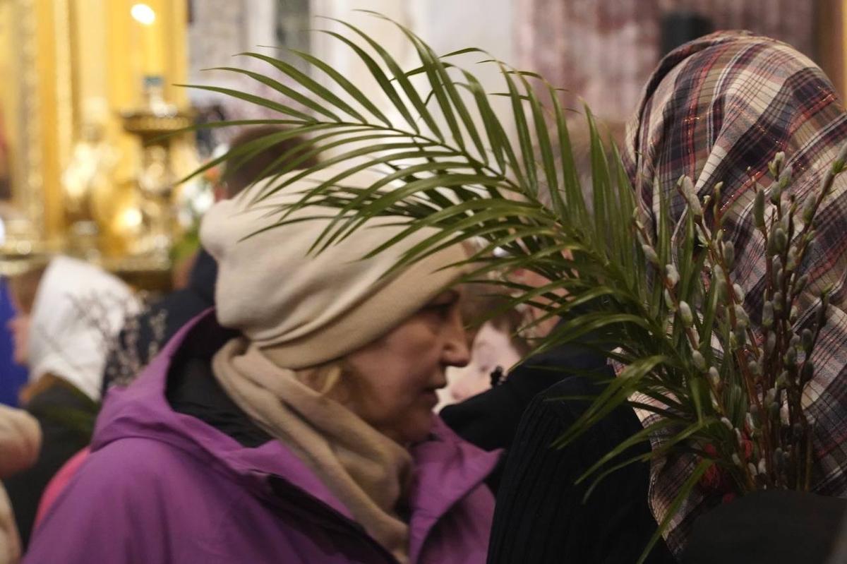 Собравшиеся в соборе верующие приносили с собой не только ветки вербы, но и пальмовые ветви — ими Иисуса Христа встречали в Иерусалиме.