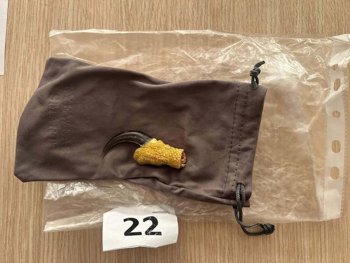 Молодого мужчину проверили на «зелёном» коридоре и при сканировании ручной клади заметили подозрительные предметы, похожие на когти и рога. Во время досмотра в рюкзаке, двух чемоданах и карманах нашли 67 предметов. Среди них были клыки, когти, части рогов, фрагменты различных животных, а также срезы бивней мамонта и высушенную голову змеи.
