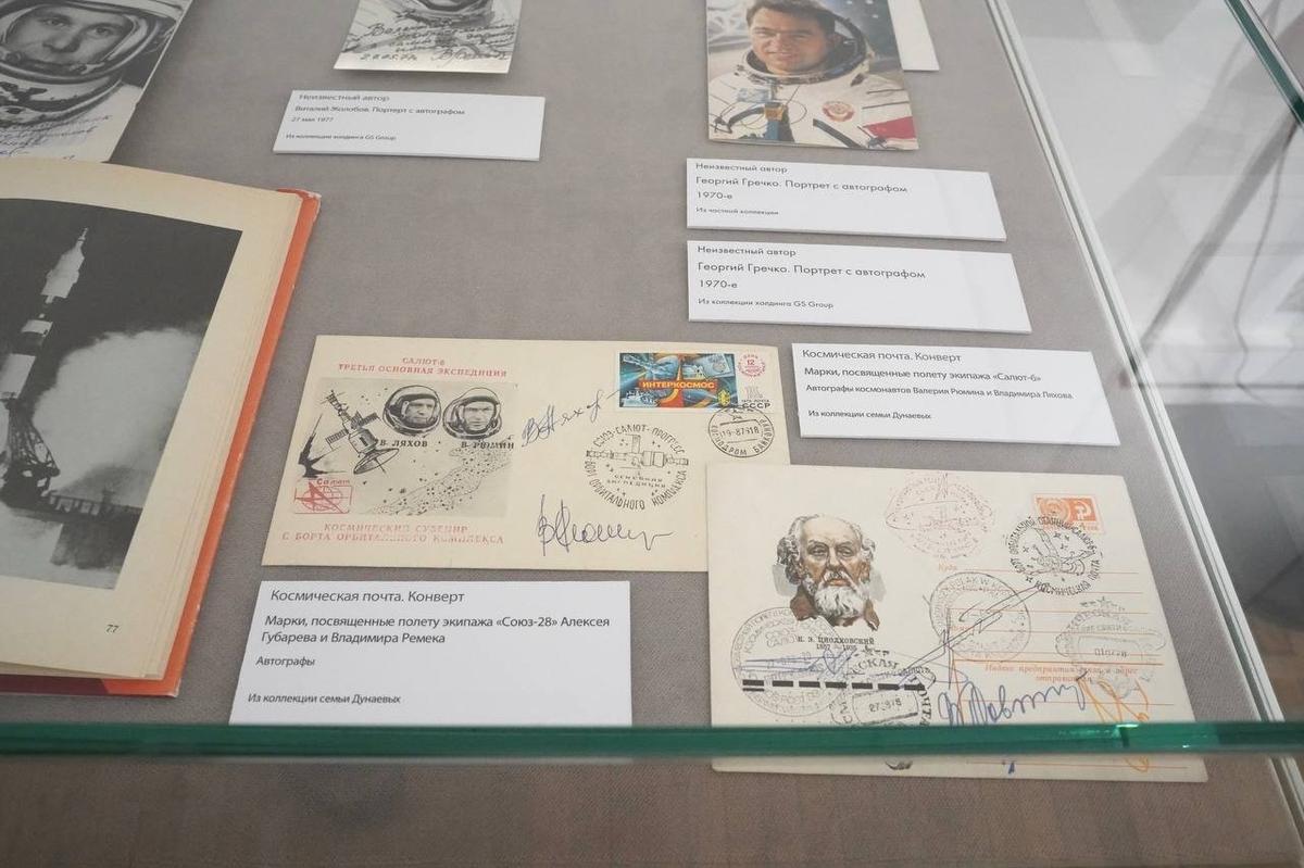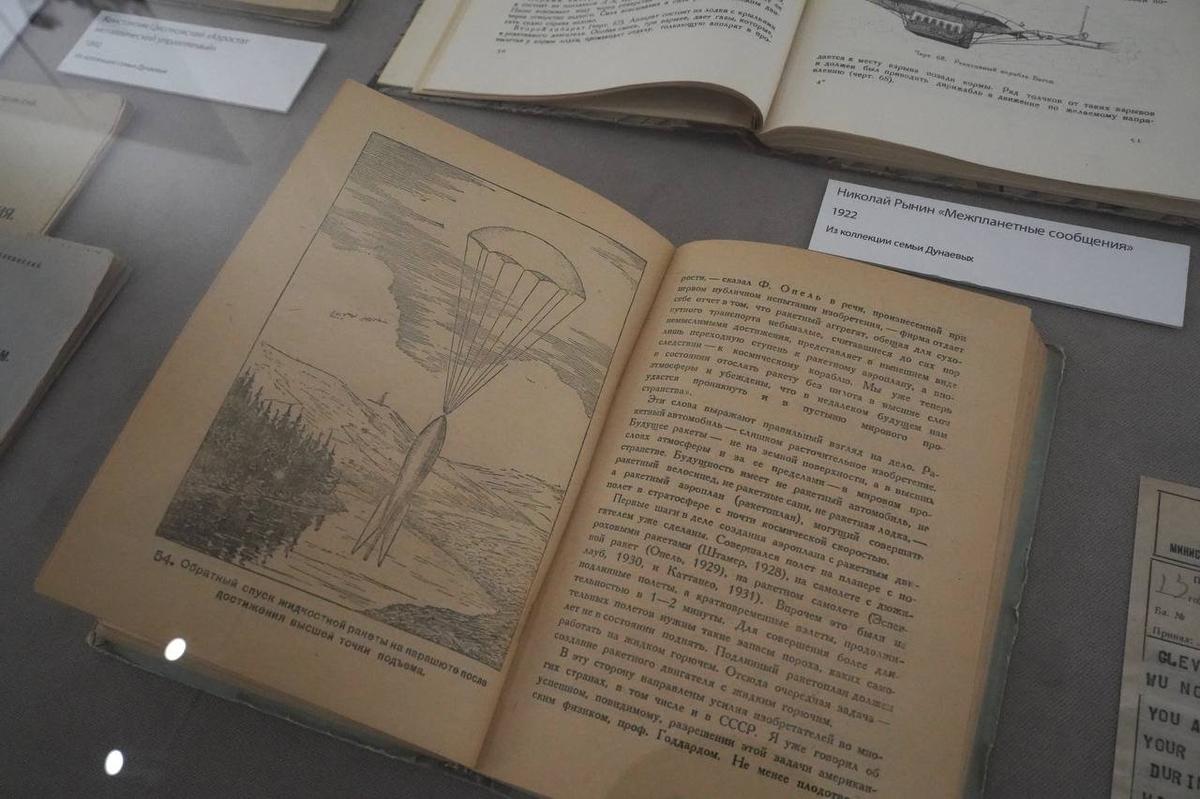 Под стеклом разложены сочинения «пророков космонавтики» Константина Циолковского и Якова Перельмана, тематические конверты и марки. Некоторые экспонаты взяты из частного собрания семьи Дунаевых.