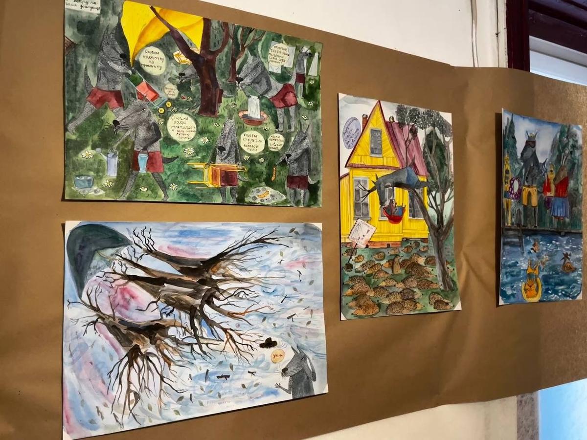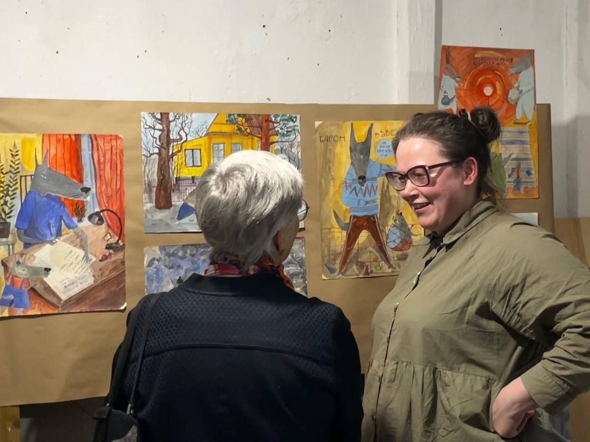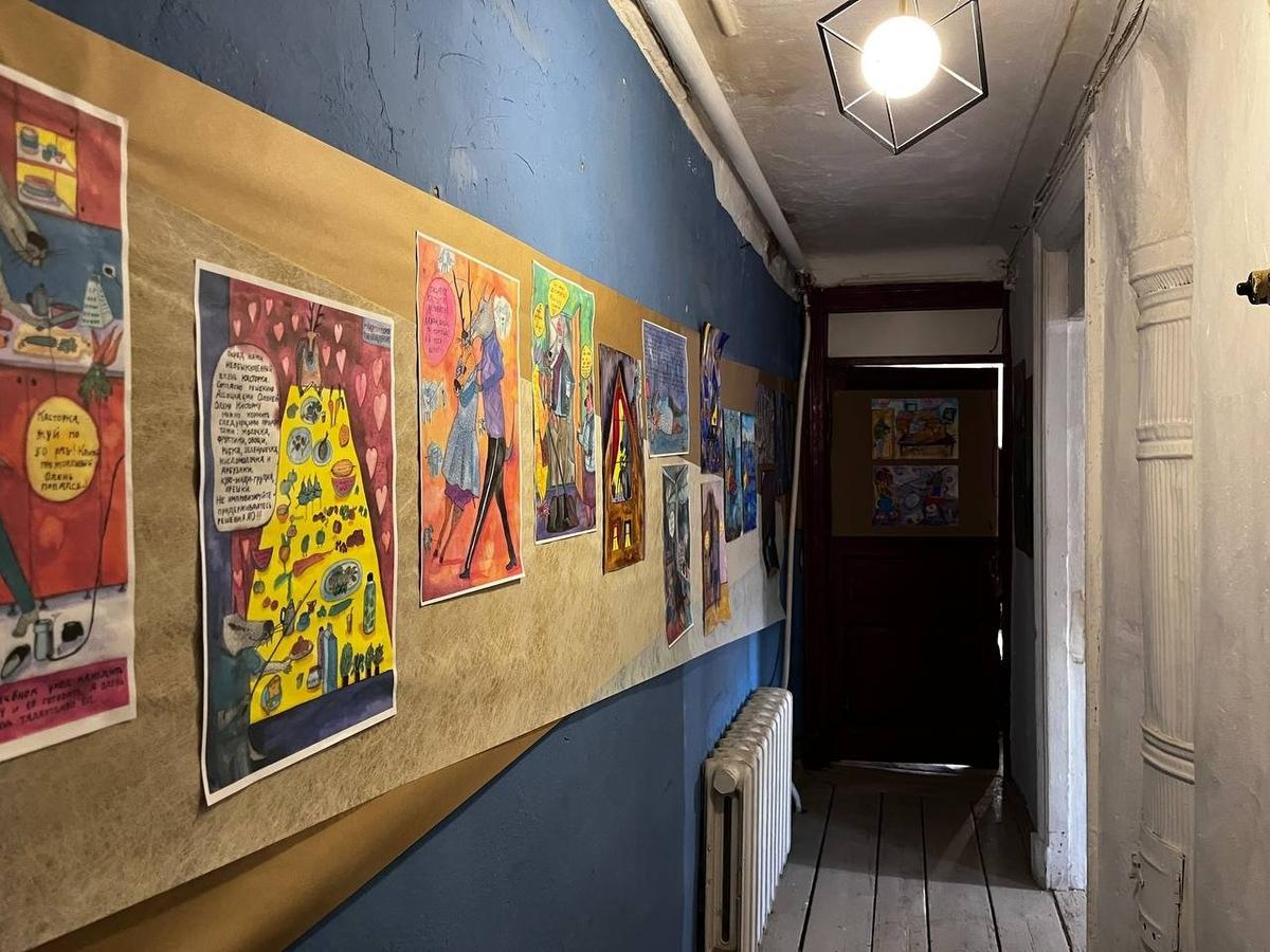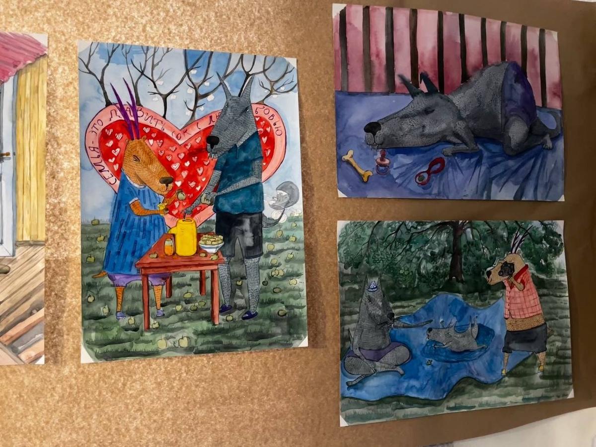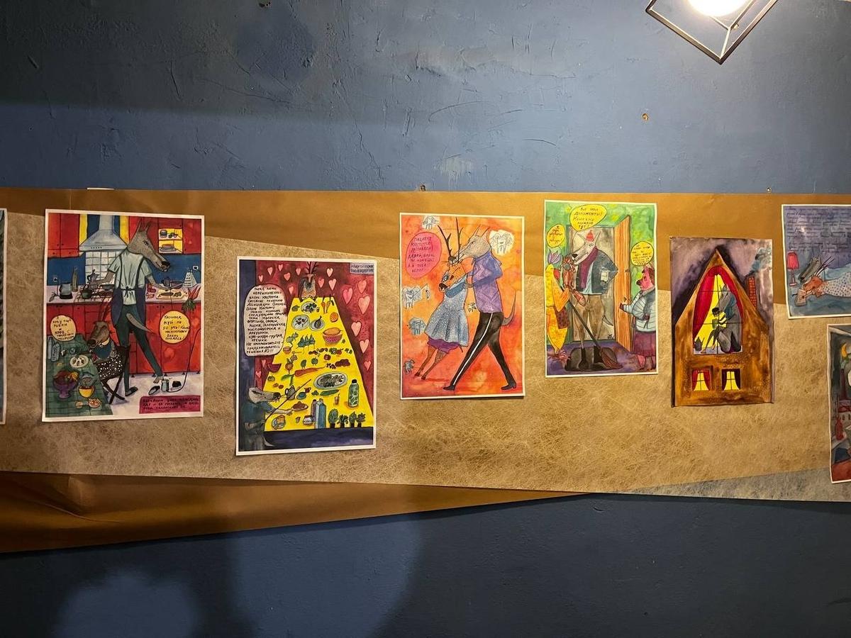 Экспозиция «Счастье из подручных материалов» открылась вечером 10 апреля в мастерской на улице Черняховского, 27. Автор — петербургская художница Соня Акимова. В основе — рисунки о самой Соне, её детях и муже Михаиле, которого в ноябре 2025 года из дома забрали под стражу.