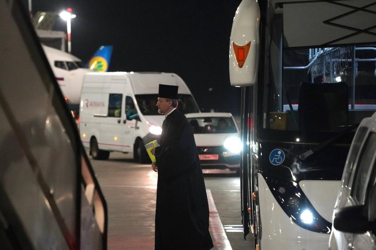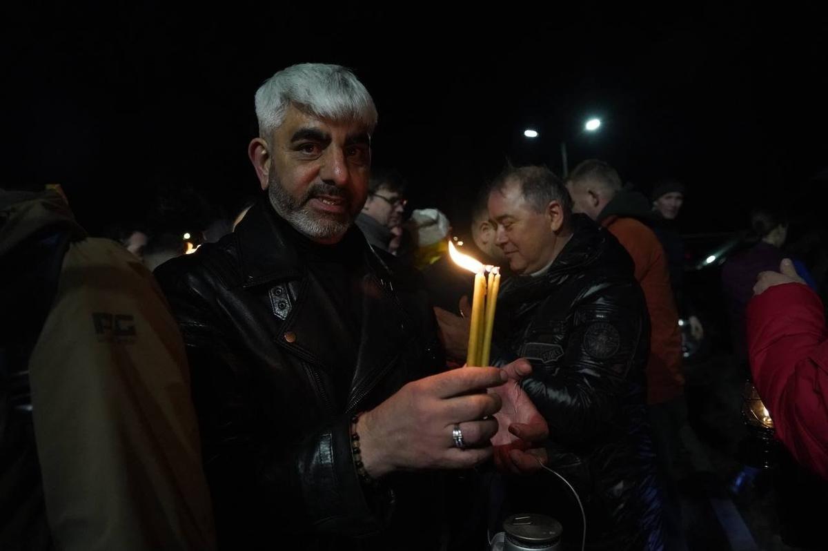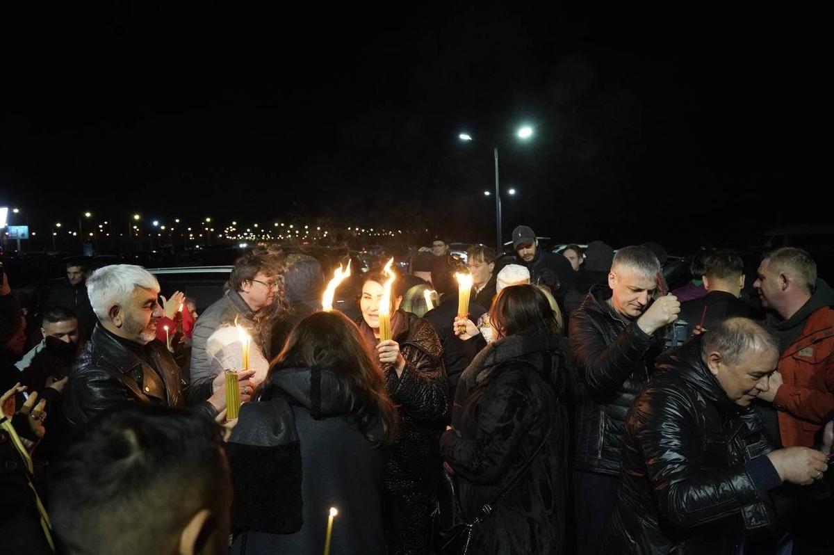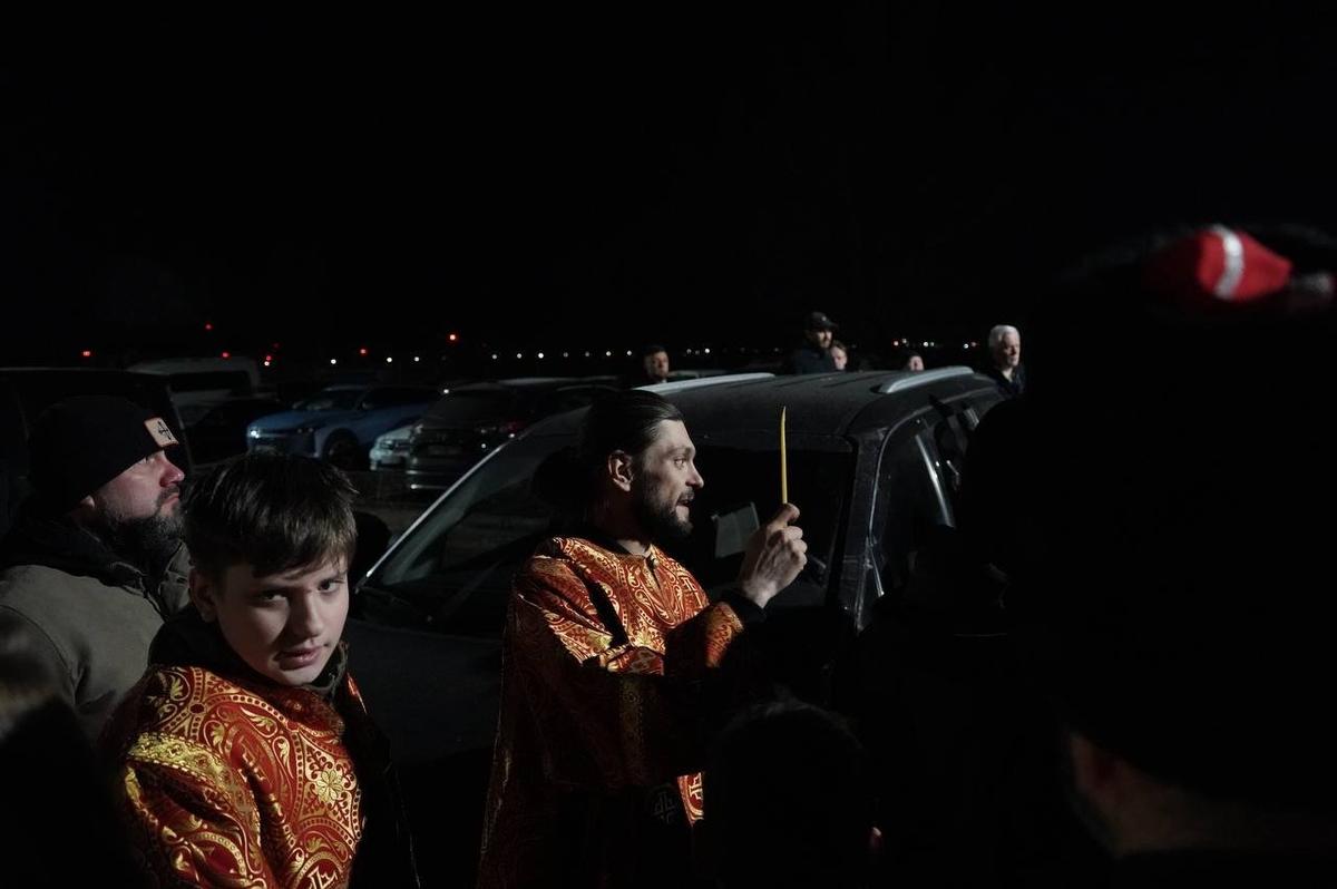 На парковке у терминала пасхальной ночью его встретили горожане и священнослужители — всего около ста человек, некоторые приезжали с детьми. В том числе присутствовали люди с надписями «Команда Путина» на куртках. Собравшиеся восклицали «Христос воскресе» — «Воистину воскресе».