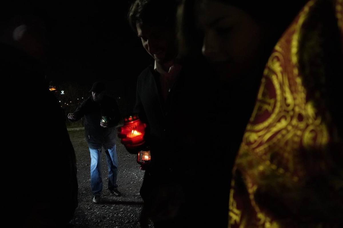 Около 3:30 с парковки на Пулковском шоссе лампадку отправили на богослужение в Казанский кафедральный собор. Там с 23:00 проходит пасхальная служба и уже состоялся Крестный ход.