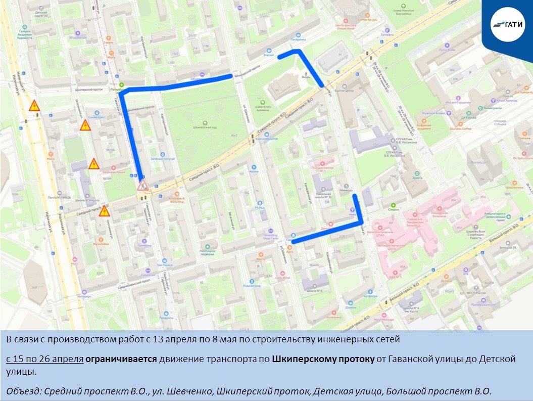 Также в этом районе с 15 по 26 апреля ограничат движение по Шкиперскому протоку — от Гаванской улицы до Детской улицы. Объехать можно по Среднему проспекту, улице Шевченко, Шкиперскому протоку, Детской улице и Большому проспекту.