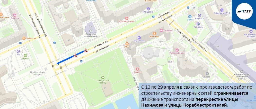 с 13 по 29 апреля ограничат движение на перекрестке улицы Нахимова и улицы Кораблестроителей. При этом до 25 апреля уже действует ограничение на пересечении улицы Нахимова и Малого проспекта. До 30 апреля полностью закрыт участок улицы Нахимова от улицы Беринга до Наличной улицы, объезд организован через Наличную улицу, Малый проспект и улицу Беринга.