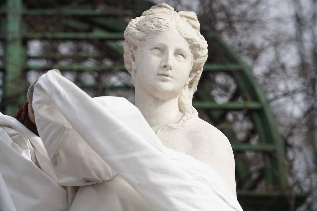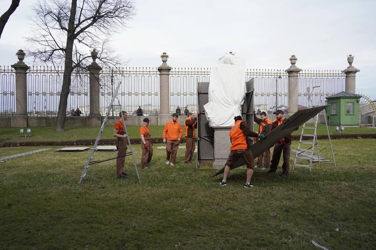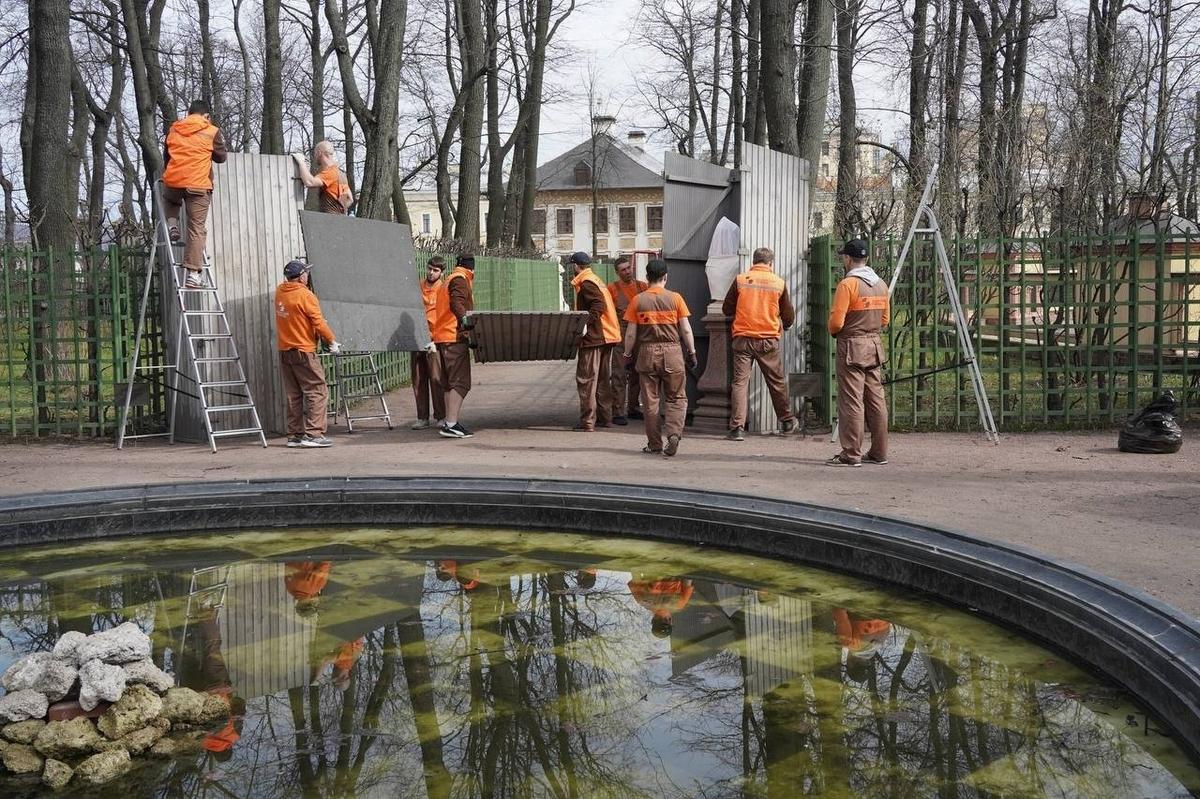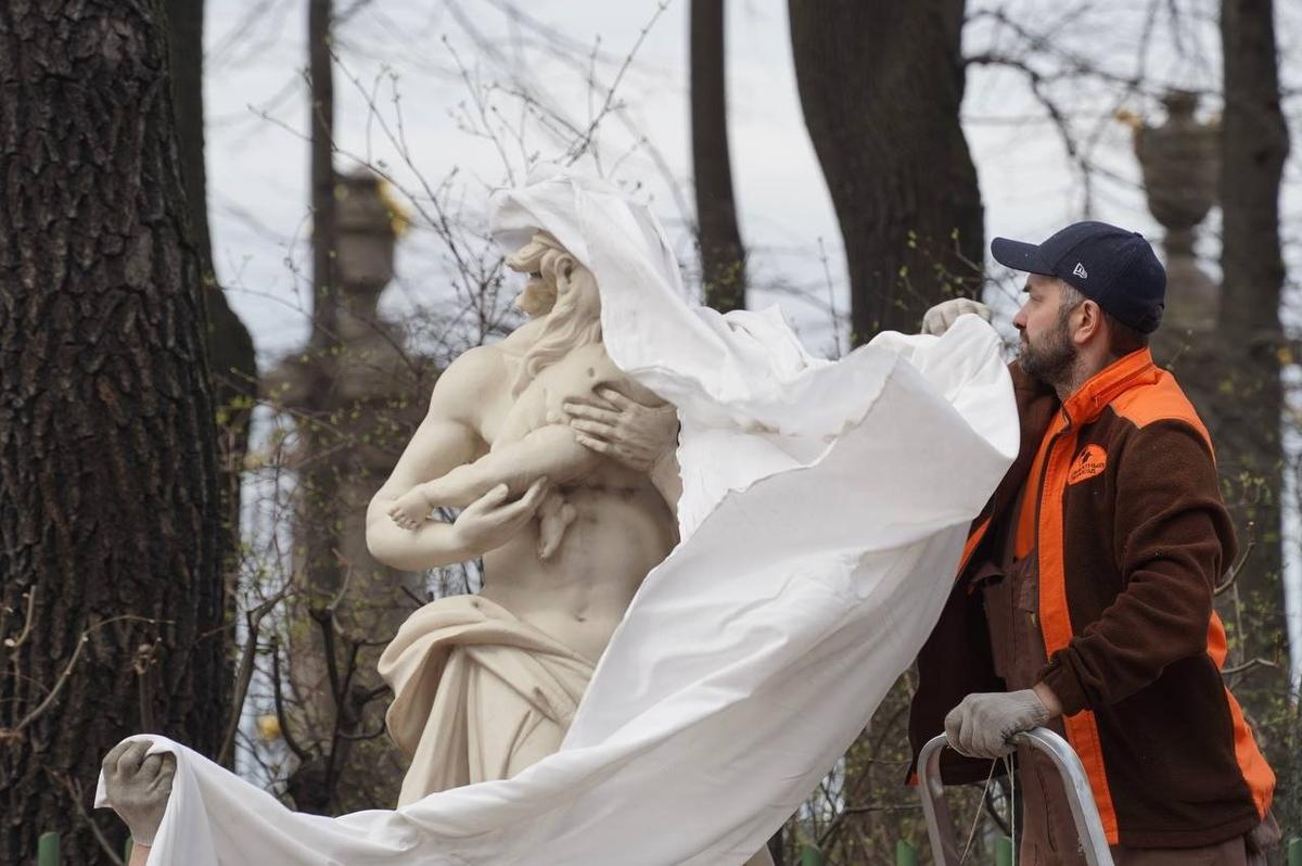 Скульптуры в Летнем саду Русского музея 15 апреля начали раскрывать в преддверии нового сезона. Показываем, как сегодня «раздевали» античных мраморных героев и богинь.