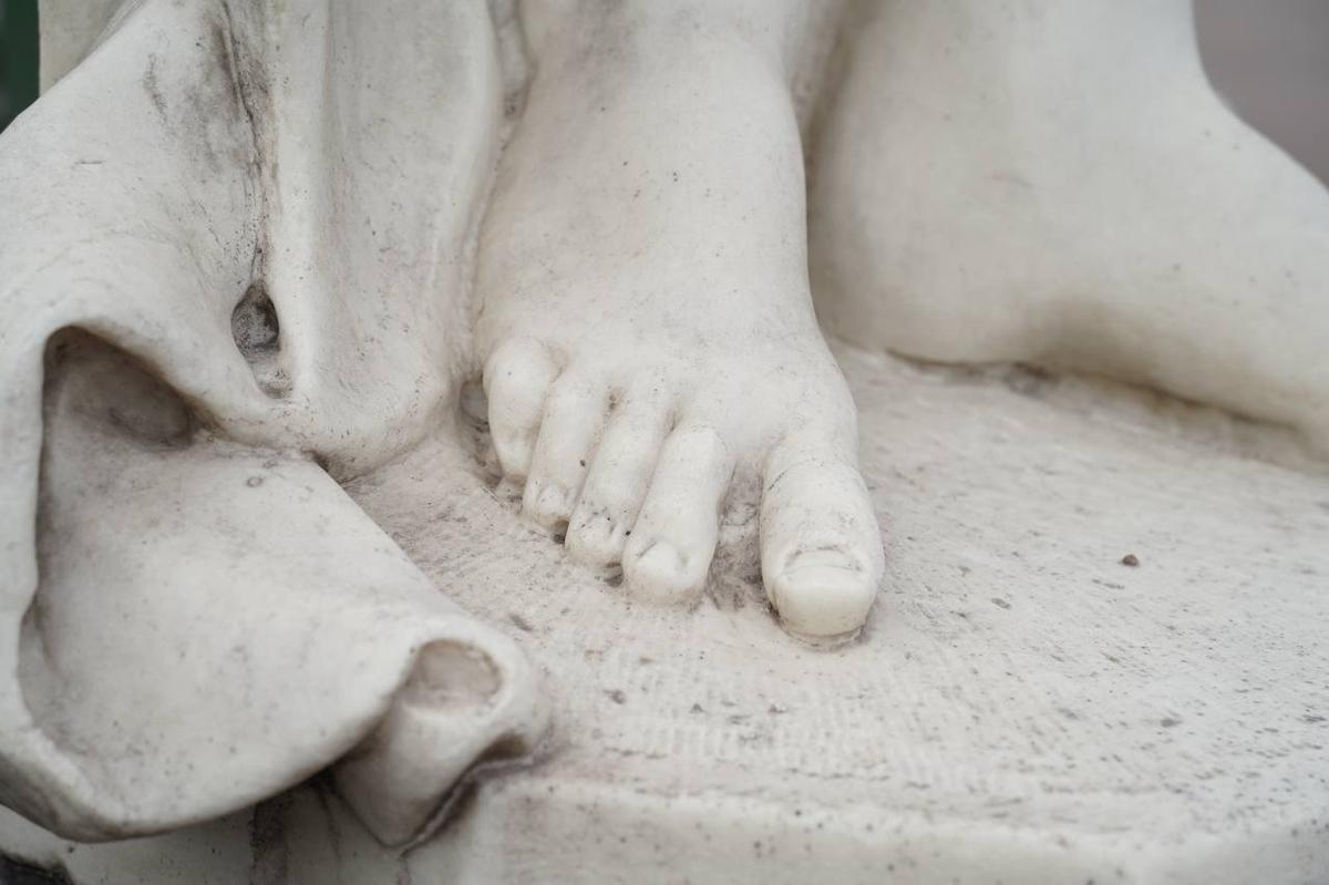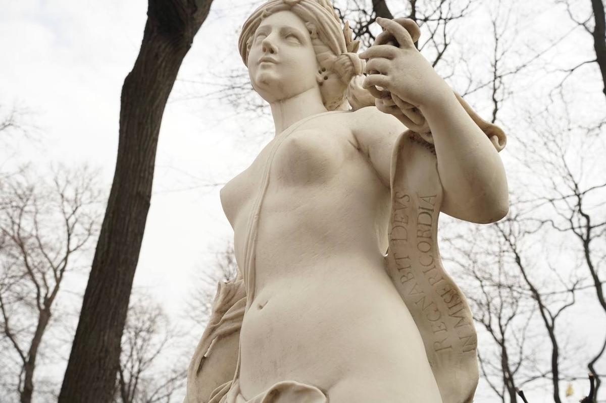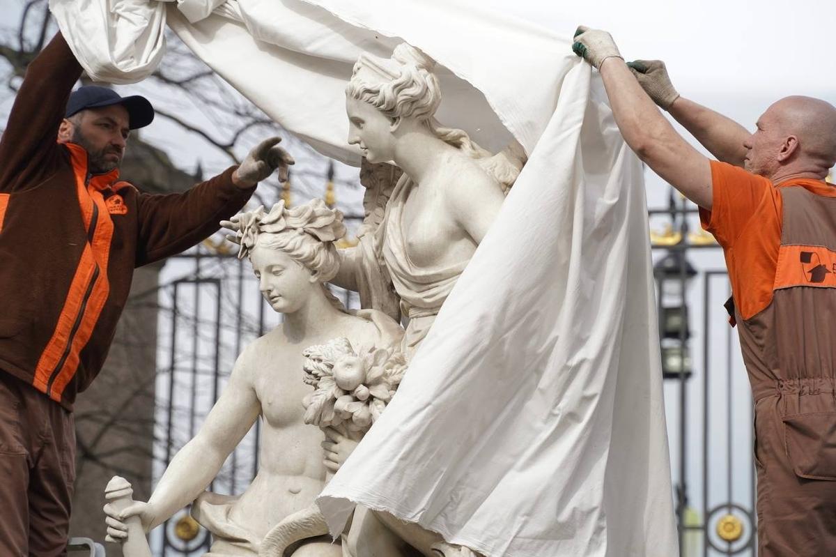 Мраморные скульптуры зимовали в специальных деревянных ящиках и были накрыты белыми чехлами. Специальную защиту устанавливают каждый год, чтобы статуи могли легче перенести холода во время зимы и не повредились из-за скачков температуры.