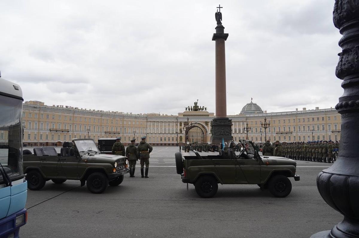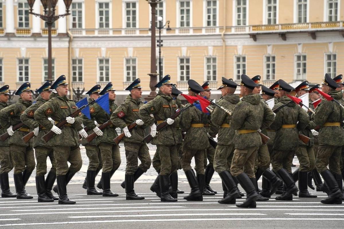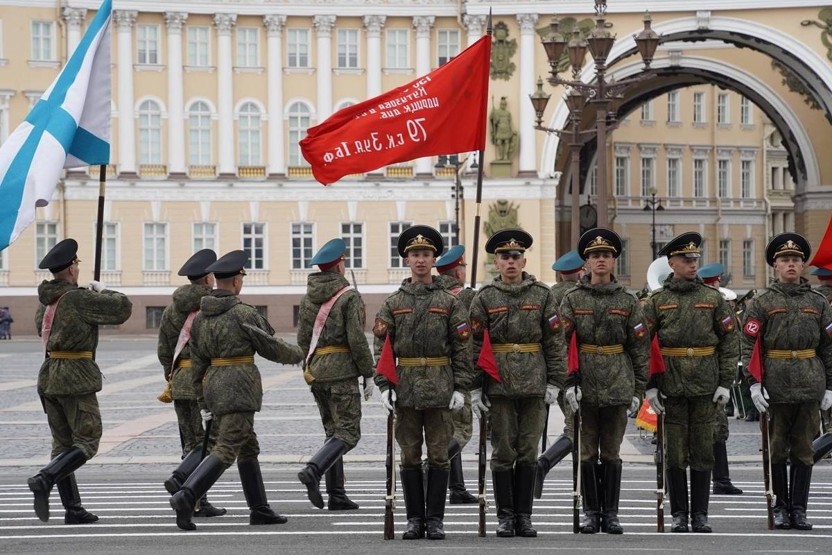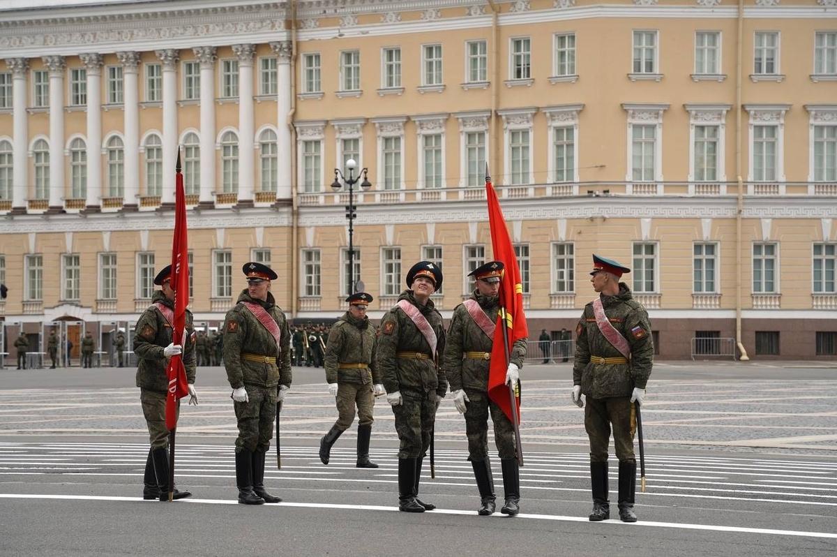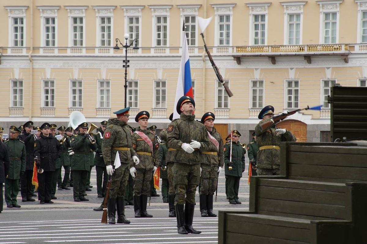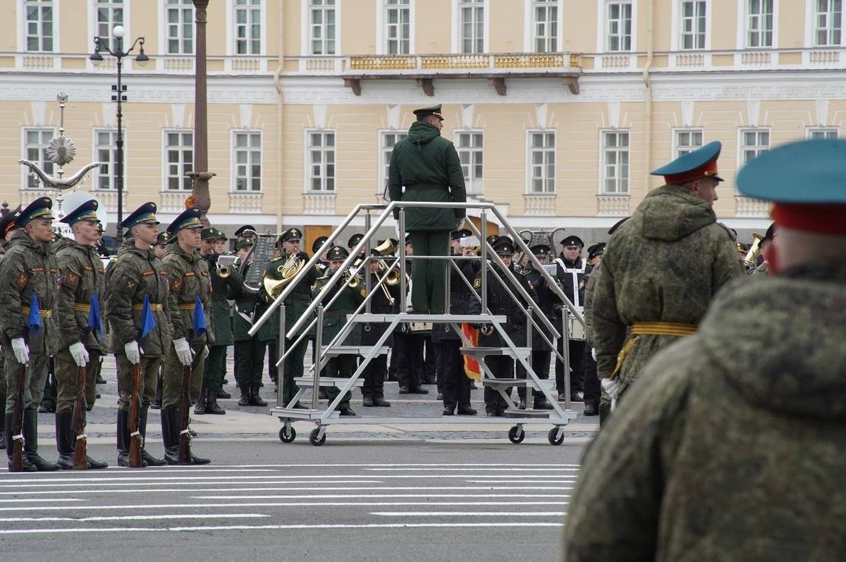 На Дворцовой площади 23 апреля прошла вторая репетиция парадных расчетов Петербургского гарнизона ко Дню Победы. Следующие состоятся 27 и 29 апреля.