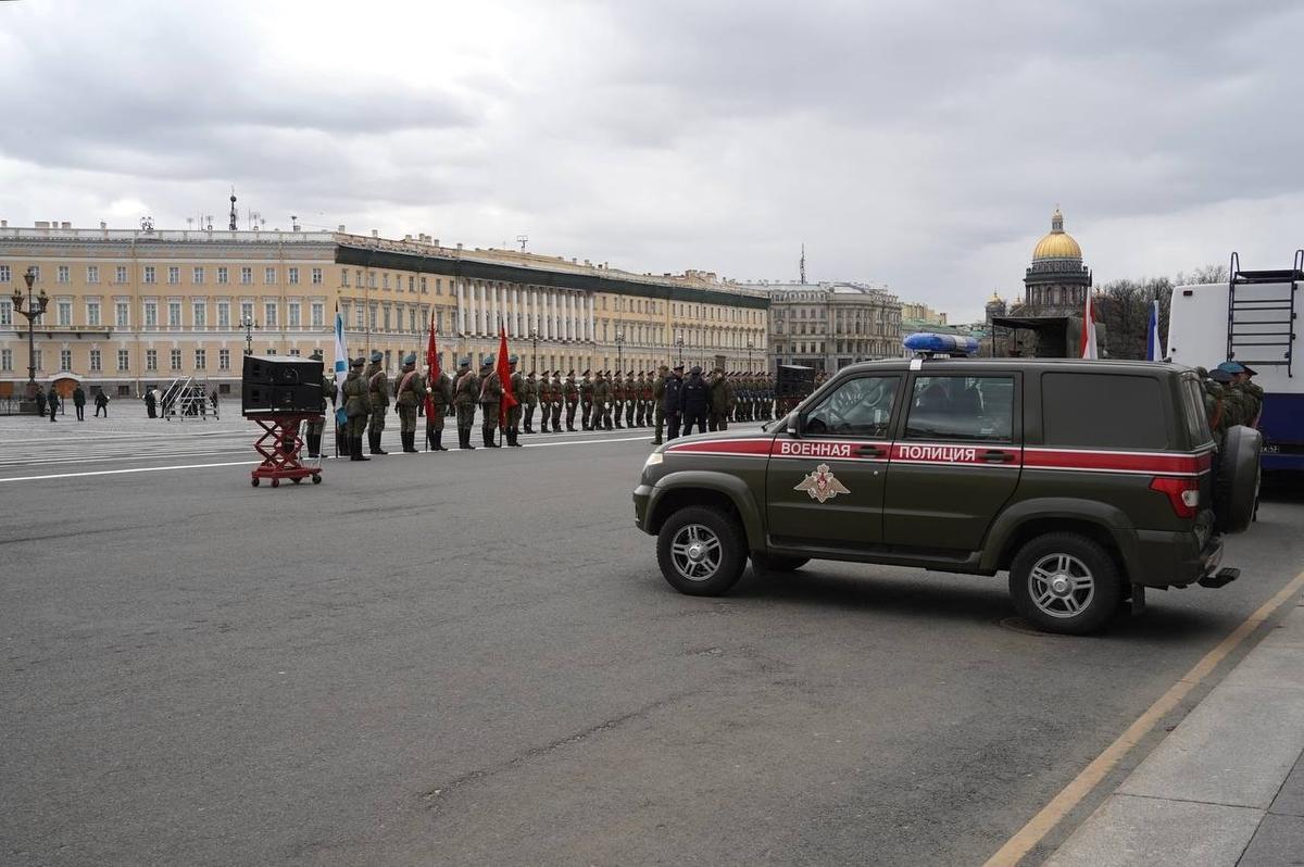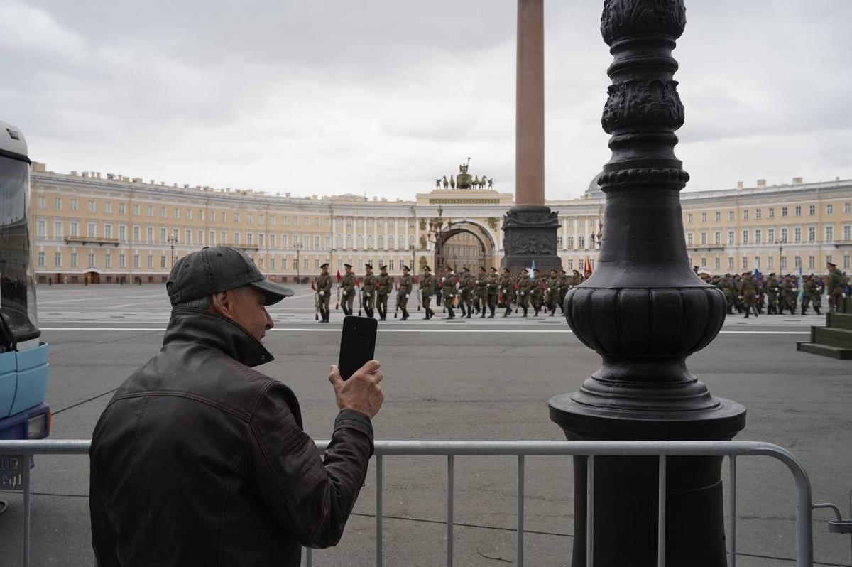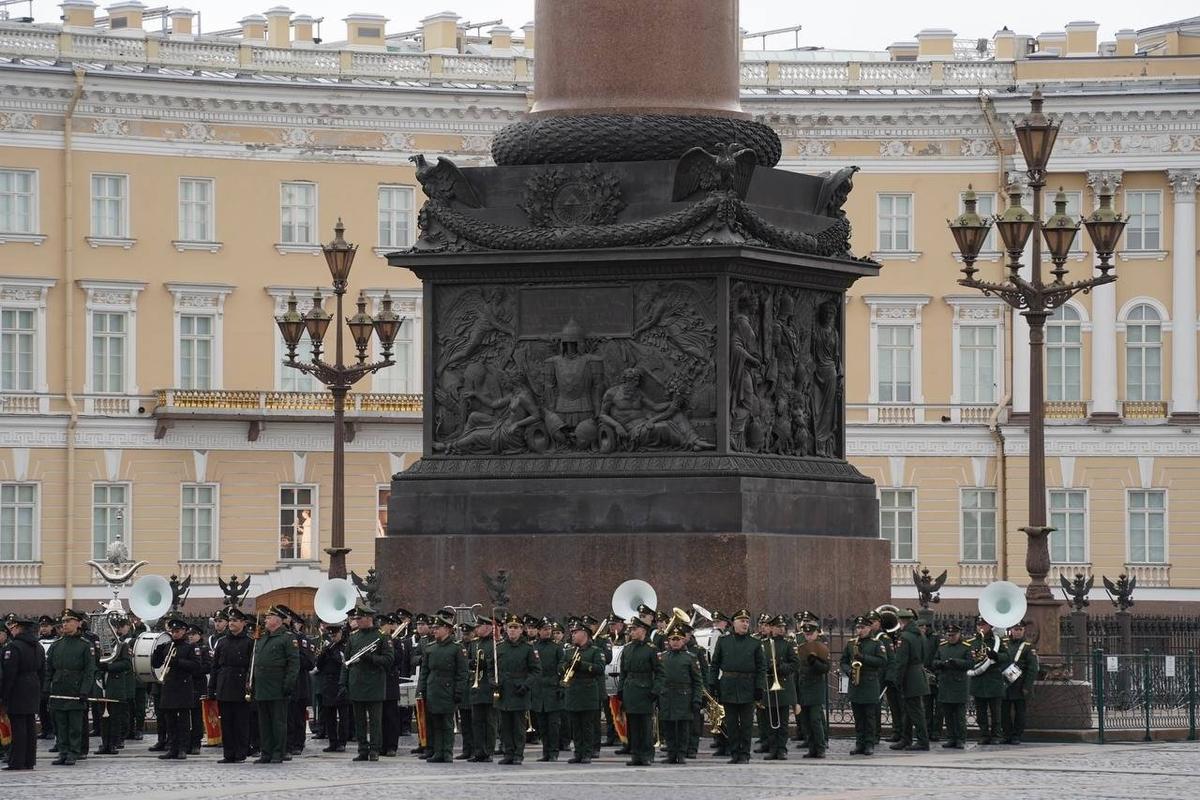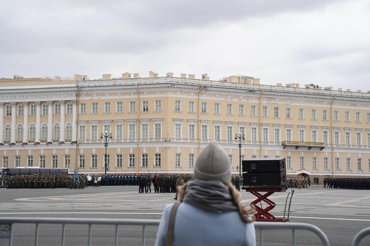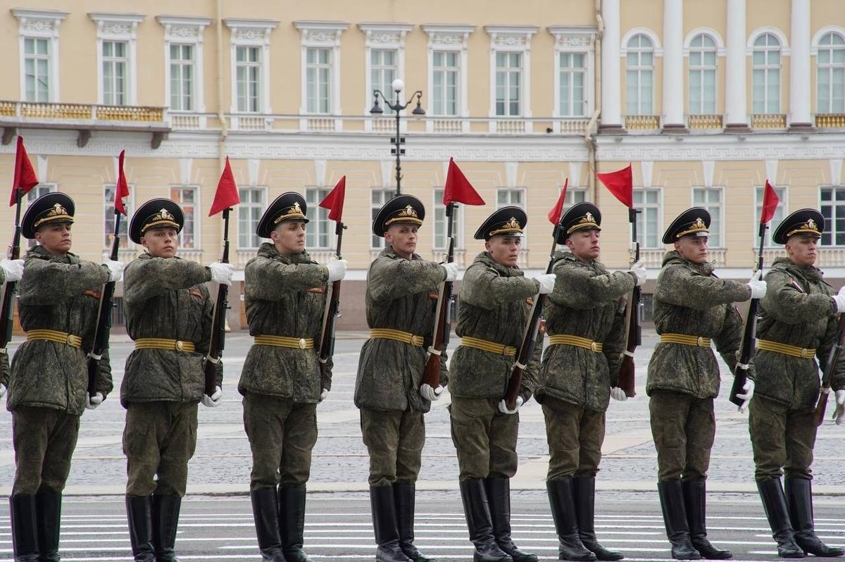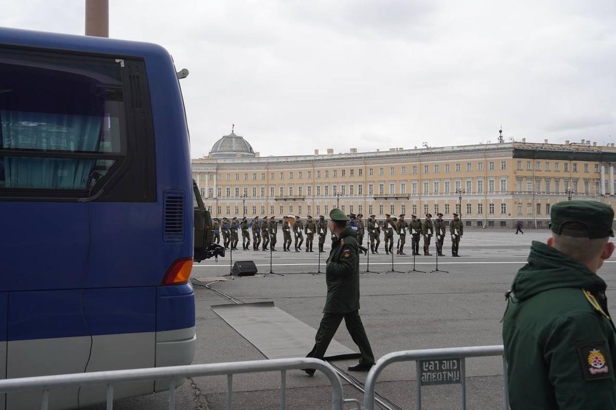 На Дворцовой площади 23 апреля прошла вторая репетиция парадных расчетов Петербургского гарнизона ко Дню Победы. Следующие состоятся 27 и 29 апреля.