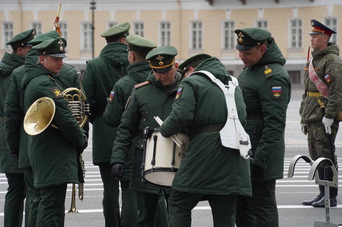 Первая репетиция прошла во вторник, 21 апреля. Также репетиция сводного военного оркестра Петербургского гарнизона состоялась 2 апреля. В ней приняли участие оркестры Северо-Западного округа Росгвардии: штаба округа, 33-й бригады оперативного назначения, специального моторизованного Измайловского полка, Центра подготовки личного состава и Военной академии Росгвардии. Всего в составе оркестра более 500 военных. Они отрабатывали строевые приёмы для слаженного выступления.