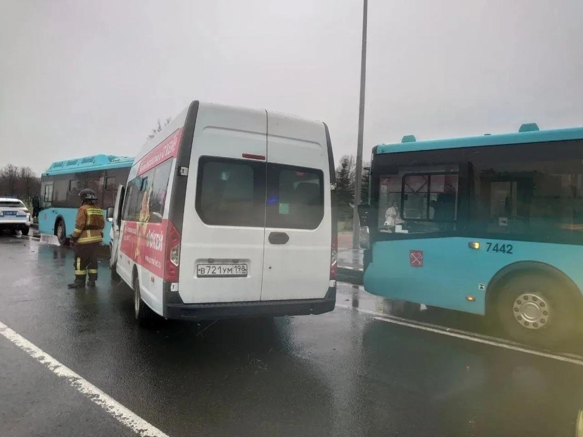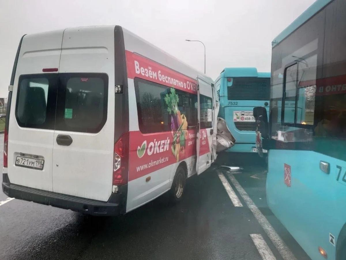 Микроавтобус ГАЗ накануне днем врезался сразу в два рейсовых автобуса лазурного цвета на Пулковском шоссе, сообщает Госавтоинспекция по Петербургу и Ленобласти. В ДТП пострадал 71-летний водитель микроавтобуса. Кроме того, получила травмы его ровесница, пассажирка «Газели».